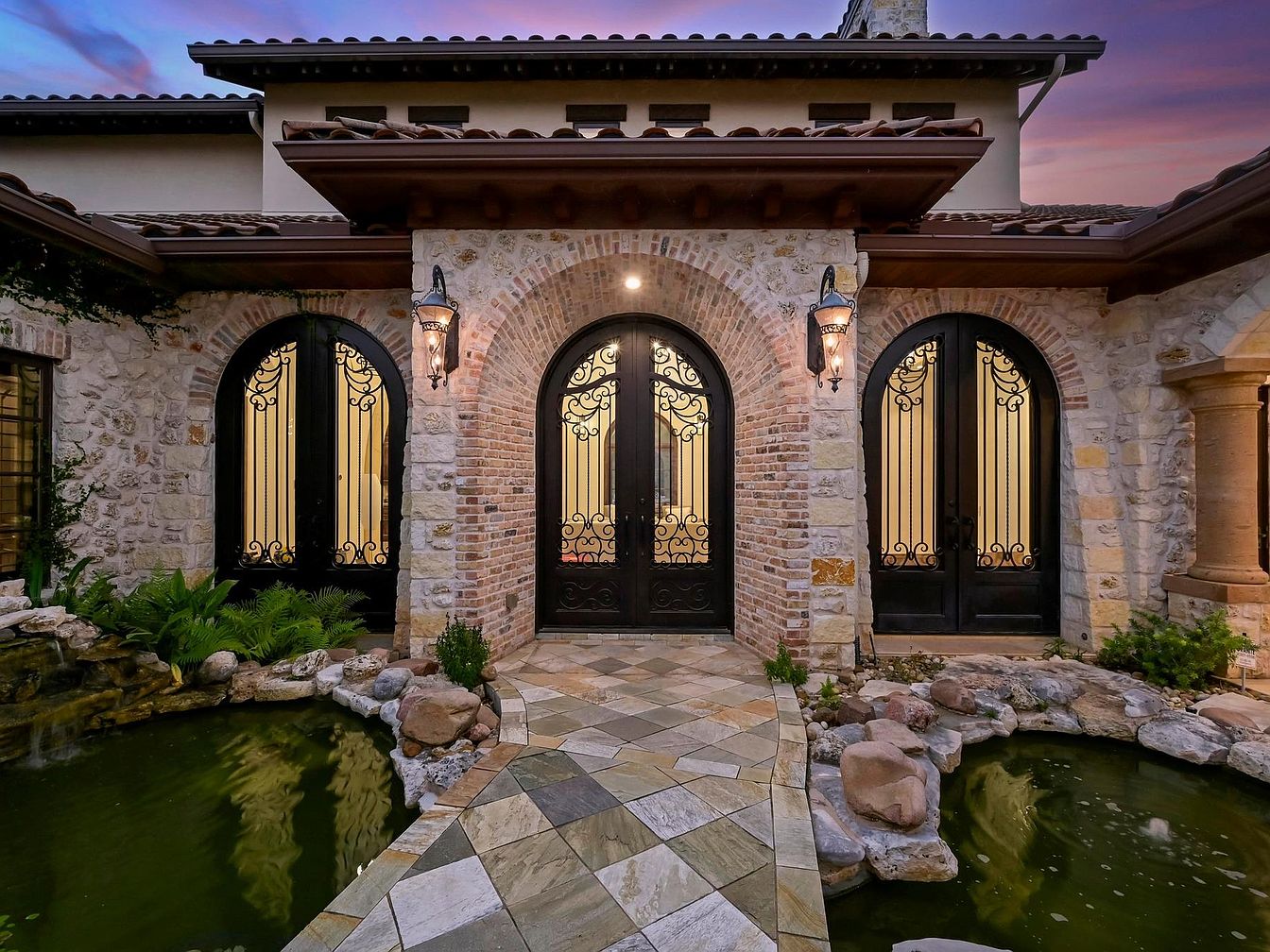 A stunning entryway welcomes guests with an elegant blend of rustic stone and brick, highlighted by dramatic wrought iron double doors and beautiful arched transoms. The pathway, crafted from patterned stone tiles, gracefully curves toward the entrance, bordered by twin koi ponds featuring natural rock accents and lush greenery for a tranquil atmosphere. Sconces emit a warm glow, creating an inviting ambiance perfect for family gatherings or festive welcomes. The combination of earthy tones in the façade and natural stonework adds a timeless charm, while the water features offer both serenity and an engaging spot for children to enjoy under supervision.