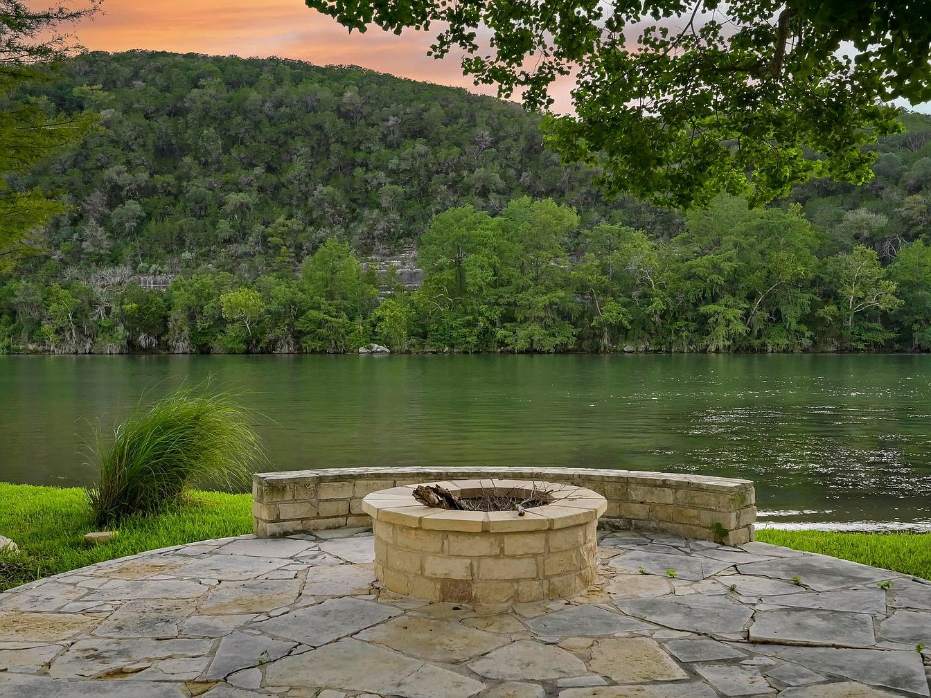Nestled on a flagstone patio at the water’s edge, this elegant outdoor fire pit area is ideal for family gatherings and relaxed evenings. The stone fire pit is surrounded by a gently curved, low stone seating wall, providing a perfect space for storytelling and roasting marshmallows. Lush green grass and mature trees frame the patio’s edge, subtly blending into the natural landscape. The view across the tranquil river to the wooded hillside creates a serene, private retreat atmosphere. The soft, earthy tones of the stonework enhance the connection to nature, making it a welcoming extension of the home.