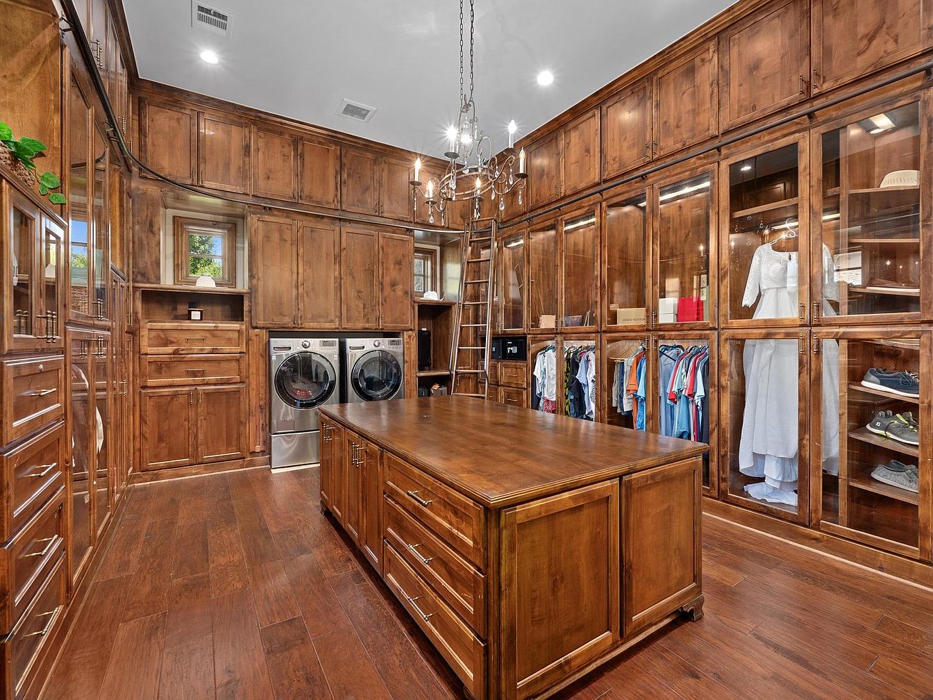 Stunning walk-in closet seamlessly integrates a laundry area for maximum convenience. Warm wood cabinetry covers every wall, offering abundant storage with built-in drawers, glass-front wardrobes, and overhead cabinets accessed by a rolling ladder. An island in the center provides extra work space and organization, and rich hardwood floors extend throughout, creating a unified, elegant atmosphere. Family-friendly touches include the washer and dryer within easy reach and ample hanging and shelf space for clothing of all ages. A soft neutral palette is highlighted by the chandelier, blending classic style with practical function for busy households.