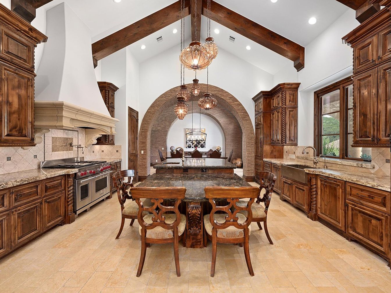 Warmth fills this inviting kitchen, seamlessly blending rustic charm with modern convenience. High, beamed ceilings and rich wooden cabinetry create a sense of spaciousness and comfort, while granite countertops and a large central island offer ample prep space for cooking and family gatherings. Textured stone tiles provide an elegant foundation, and a suite of stainless steel appliances stands ready for everyday meals or special occasions. Family-friendly touches include plentiful seating around the island, easy-to-clean surfaces, and an open archway connecting to the dining area, perfect for entertaining or enjoying time together. Large windows invite natural light, enhancing the welcoming ambiance.