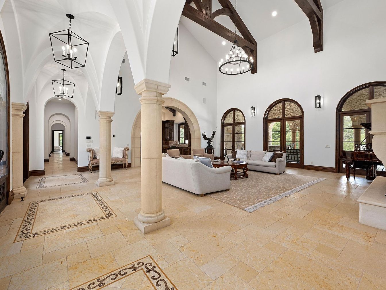 A grand living room connects seamlessly to an arched hallway, creating an inviting and open layout perfect for family gatherings and entertaining. The space features soaring vaulted ceilings with exposed wooden beams, elegant columns, and expansive arched windows that flood the area with natural light. Neutral tones dominate the color scheme, with warm beige stone floors adorned with intricate borders and soft gray and cream upholstered furniture. A large area rug anchors the seating area, providing a cozy spot for conversation. Classic architectural details, such as wrought iron chandeliers and a stately fireplace, complete the sophisticated yet family-friendly ambiance.
