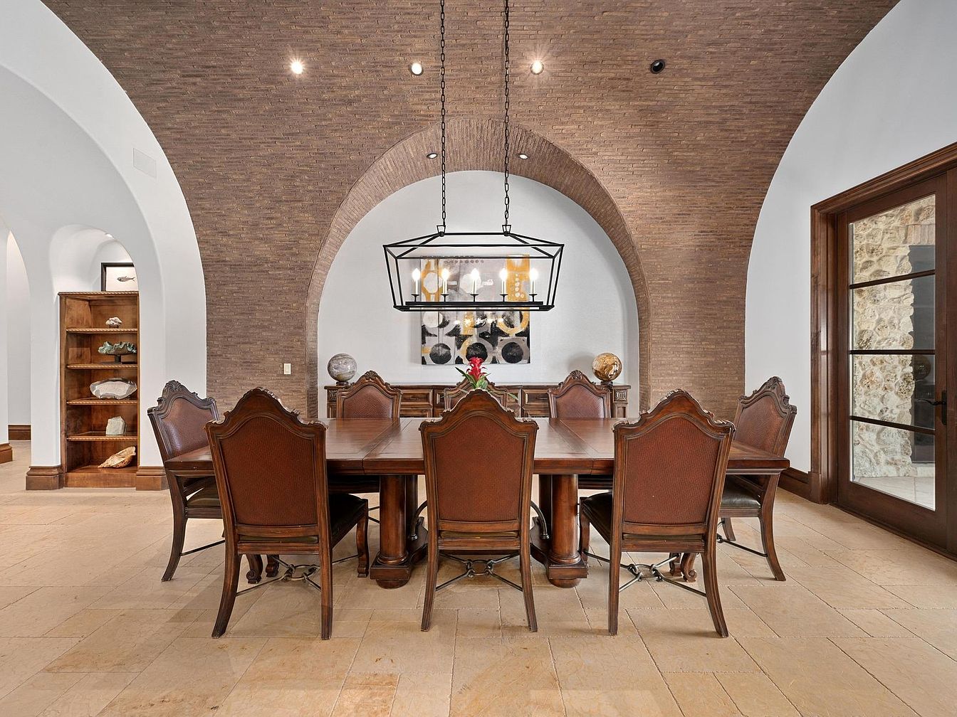 A grand formal dining room designed for both elegant gatherings and family meals, featuring a richly detailed wooden table with eight matching chairs arranged beneath a striking geometric chandelier. Tall arched ceilings clad in textured brick create a dramatic yet welcoming ambiance, while wide arched doorways offer open sightlines to adjacent living areas. Warm neutral tones are balanced by the natural stone flooring and white walls, enhancing the room’s openness and comfort. Family-friendly touches include spacious seating, easy access to shelving for décor or storage, and ample space making it ideal for both everyday use and special occasions.