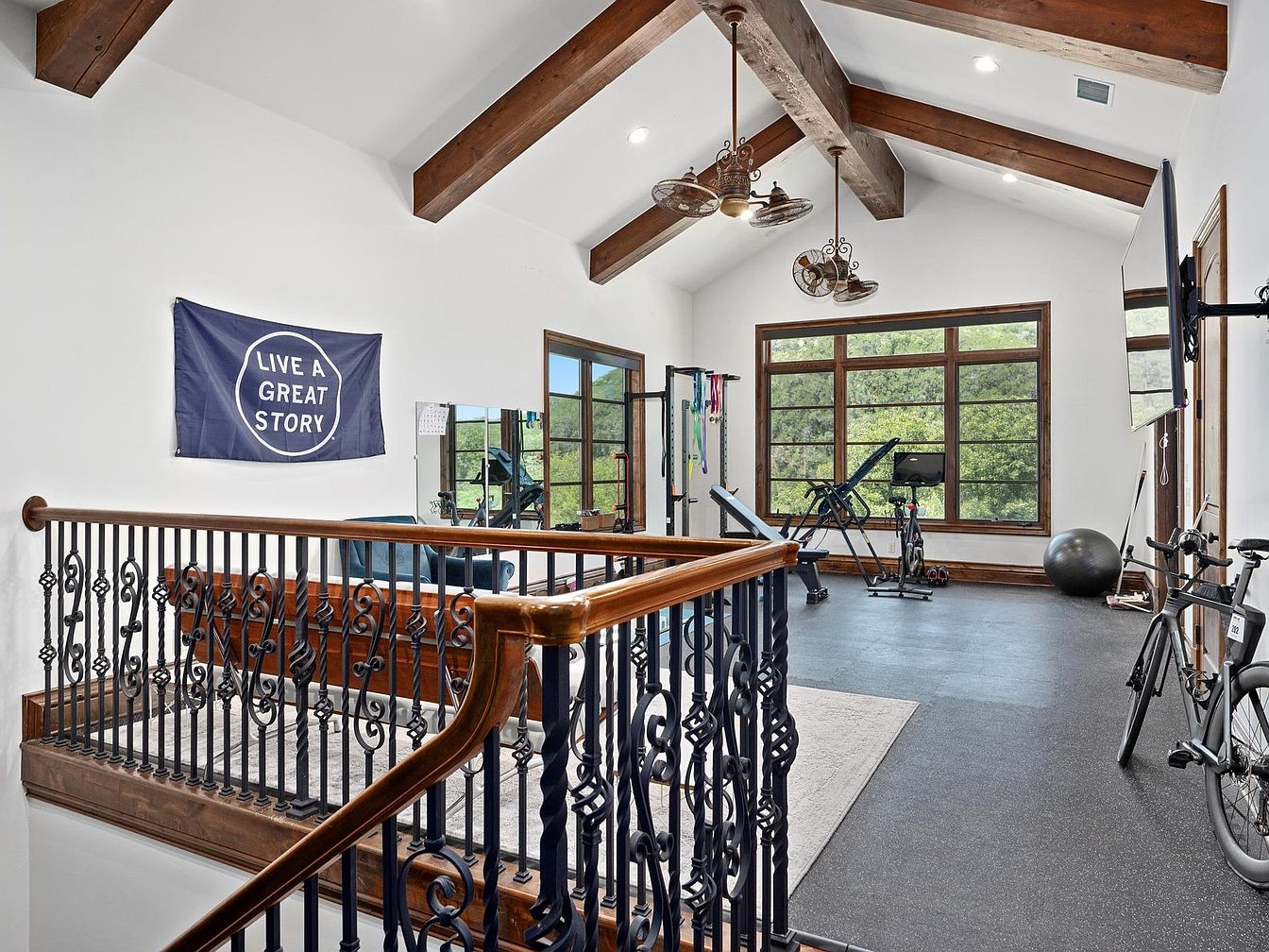 A spacious and bright home gym occupies this versatile loft area, designed with family wellness and motivation in mind. Large windows flood the space with natural light and frame lush green views, creating a refreshing workout ambiance. Exposed wooden ceiling beams and dark wood accents add a touch of rustic elegance to the crisp white walls. Functional rubberized flooring supports a variety of activities, with fitness equipment and a Peloton bike ready for use. The open railing and motivational decor promote an inviting atmosphere for every family member, while the mounted TV provides entertainment during workouts or family exercise sessions.