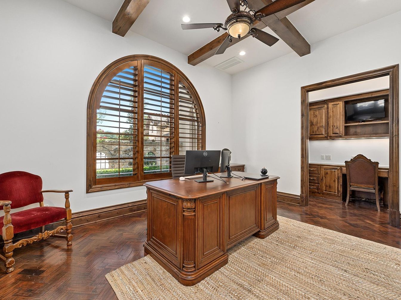 A spacious and inviting home office features a dramatic arched window with wooden shutters that flood the room with natural light, creating an inspiring setting for productivity. The room showcases elegant wood elements throughout, including a stately desk, classic herringbone floors, and exposed ceiling beams. A rich red armchair adds a cozy family-friendly touch, while the separate workstation with built-in cabinetry provides space for organization or shared family use. The neutral palette of white walls, warm brown woods, and natural textures in the area rug bring both sophistication and comfort, ideal for work or creative pursuits in a welcoming atmosphere.