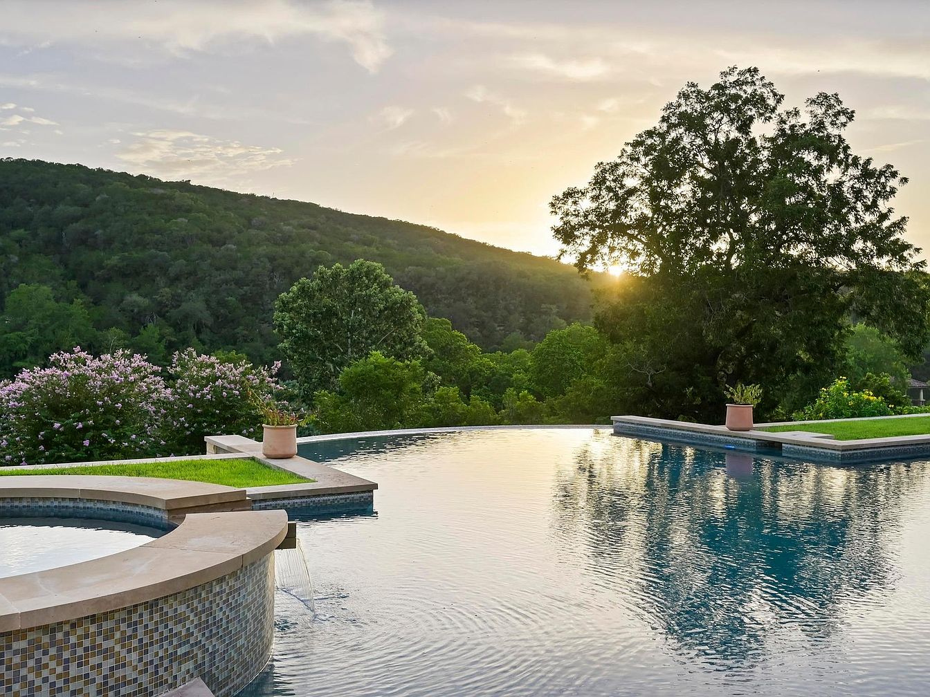A stunning infinity-edge pool sits at the heart of this serene backyard oasis, with views of rolling green hills and mature trees. Elegant stone coping defines the pool’s shape, while mosaic tilework adds a touch of luxury to the built-in spa. Planters with blooming flowers and manicured turf areas create family-friendly zones for relaxation and play. The tranquil water stretches seamlessly toward the horizon, blending with the natural landscape. Warm neutral tones in the hardscape complement the lush greenery, while the sunset offers a magical atmosphere perfect for both peaceful evenings and lively gatherings.
