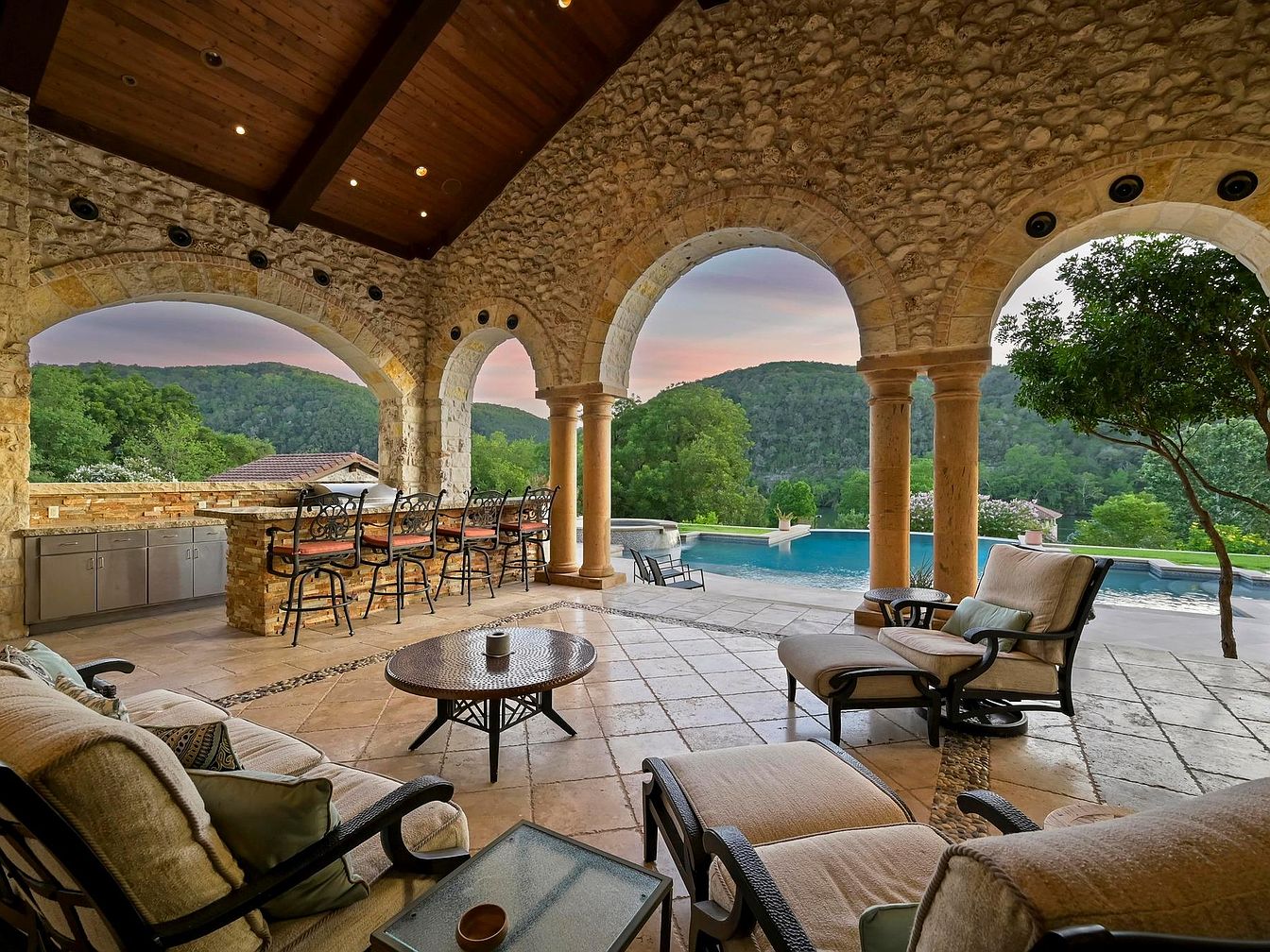This covered patio offers a serene outdoor living space with rustic stone arches and a warm wooden vaulted ceiling, creating a Mediterranean-inspired ambiance. Built-in bar seating overlooks the expansive pool and breathtaking hillside views, making it perfect for family gatherings or weekend entertaining. Comfortable cushioned lounge chairs and sofas provide ample seating for relaxation. The tiled flooring is both durable and elegant, ideal for high-traffic areas. Subtle accent lighting embedded in the ceiling adds charm as the sun sets. This inviting layout seamlessly blends indoor comfort with outdoor beauty, encouraging family time and memorable summer evenings together.