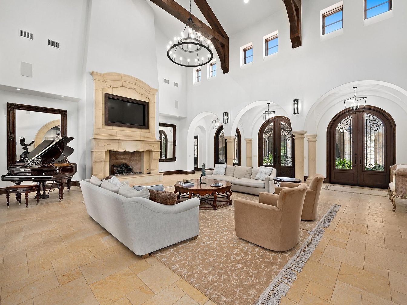 Soaring ceilings with exposed dark wood beams create an airy, majestic atmosphere in this grand living room. Large arched windows and French doors provide abundant natural light and seamless access to outdoor spaces, enhancing the family-friendly, inviting feel. Plush sofas and armchairs, arranged around a neutral patterned rug, offer generous seating for gatherings, while a grand piano in the corner invites music and entertainment. The soft beige-toned stone fireplace provides a stunning focal point beneath a mounted television. Elegant wall sconces and oversized mirrors further amplify the spaciousness, creating a harmonious blend of comfort, luxury, and timeless design.