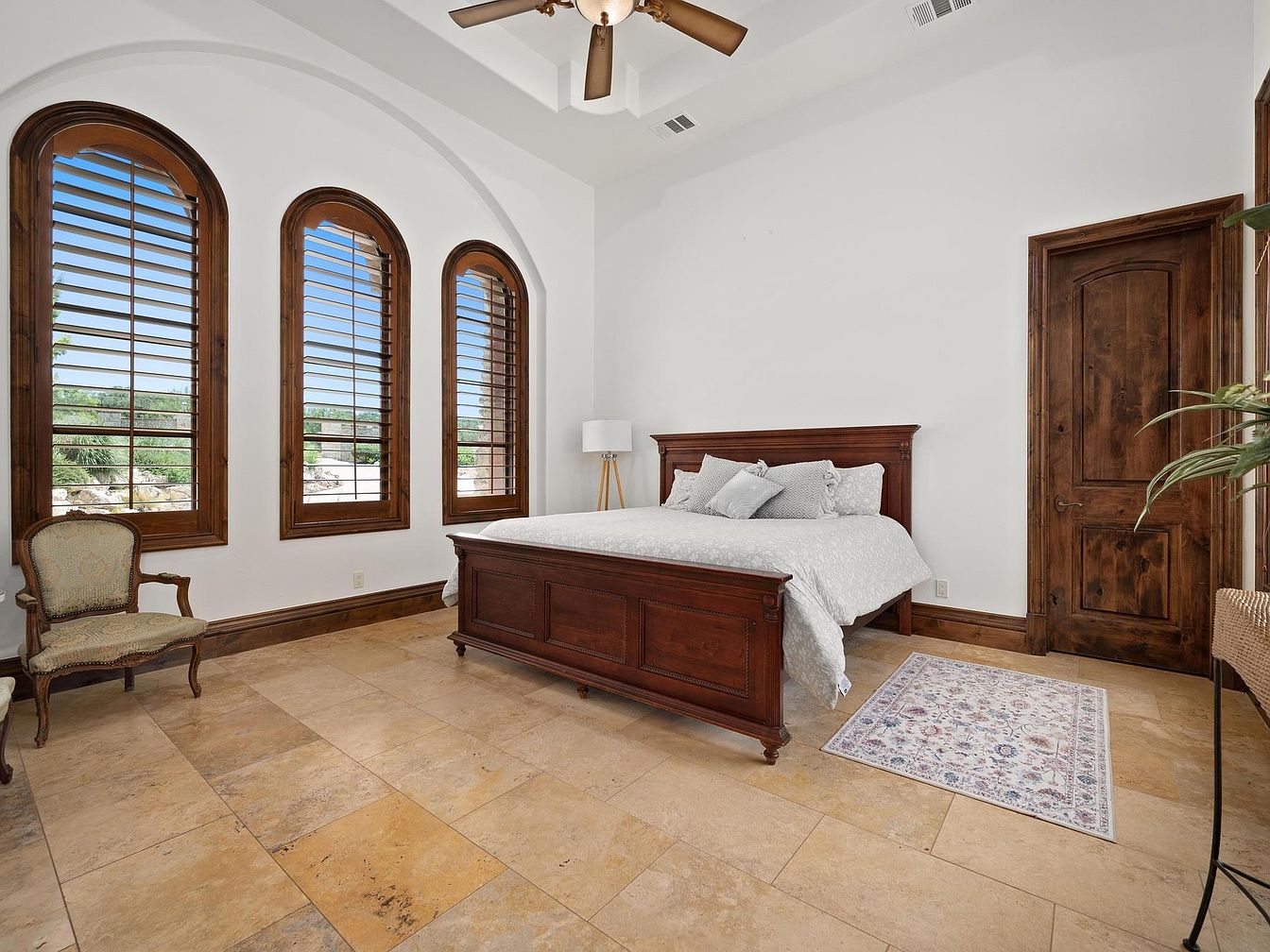 This primary bedroom offers a serene and spacious layout, featuring high ceilings adorned with a stylish ceiling fan and grand arched windows framed in rich wood, flooding the room with natural light. Warm stone tile floors pair beautifully with the dark wood bedframe, side chair, and matching trim that add a touch of classic elegance. The crisp white walls create a fresh, clean backdrop while the pastel area rug and cozy bedding introduce subtle softness. Family-friendly touches include the durable flooring and ample natural sunlight, creating a welcoming environment for relaxation and unwinding after a busy day.