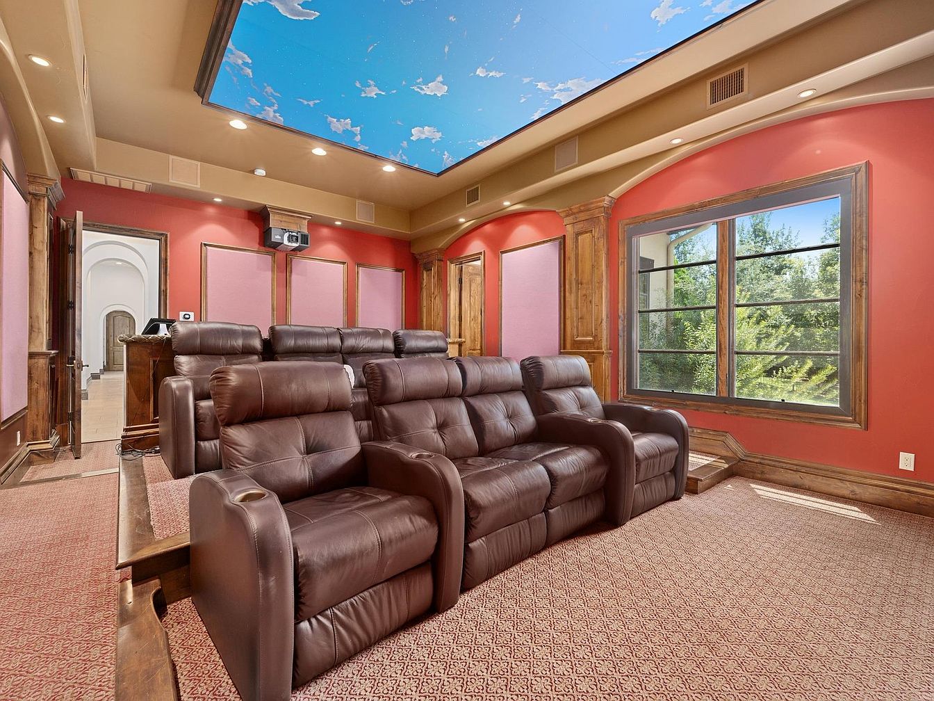 This luxurious home theater boasts tiered leather recliners, offering a comfortable setting for family movie nights or entertaining friends. The warm red walls, accented with natural wood trim and paneling, create an inviting atmosphere, while the large windows bring in abundant natural light and provide scenic outdoor views. The dramatic ceiling features a sky mural, adding a touch of whimsy and spaciousness to the room. Deep, plush carpeting enhances sound absorption and coziness, making it safe for kids to play or relax. This thoughtfully designed space balances elegance, comfort, and family-friendly functionality for ultimate at-home entertainment.