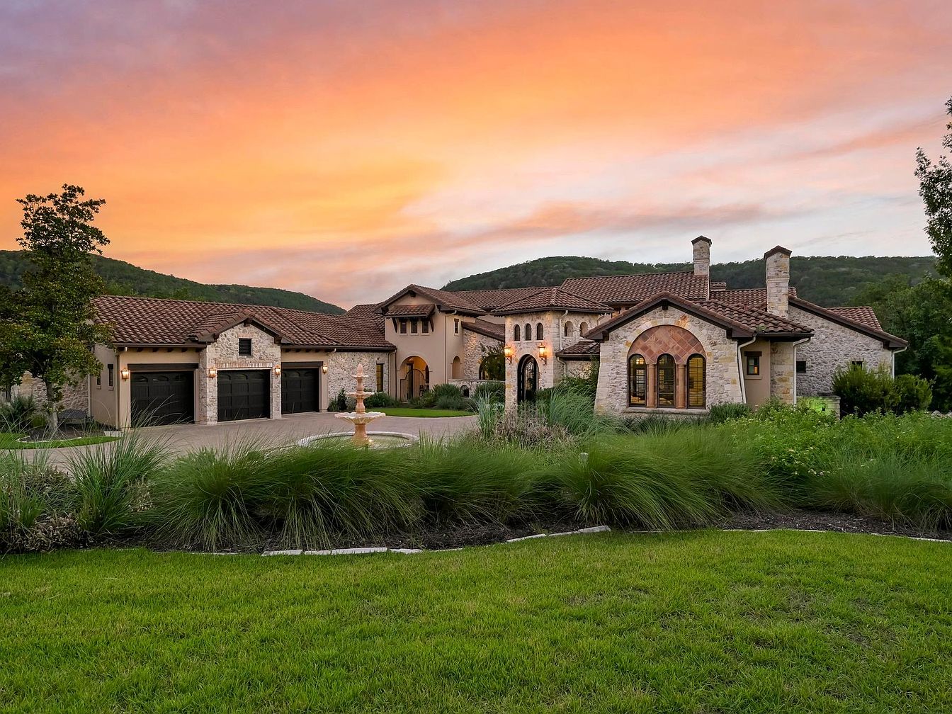 A grand Mediterranean-inspired front exterior features warm stone and stucco facade accented with terracotta roof tiles and arched windows, inviting natural sunlight into the home. A circular driveway with a charming fountain centerpiece enhances curb appeal and offers easy vehicle access. Manicured lawns and ornamental grasses frame the approach, providing a safe and open space for children to play. Subtle exterior lighting and double entry doors deliver both security and elegance. The three-car garage is seamlessly integrated, ensuring ample space for families. Rolling hills and a dramatic sunset sky in the background create a serene, picture-perfect family setting.