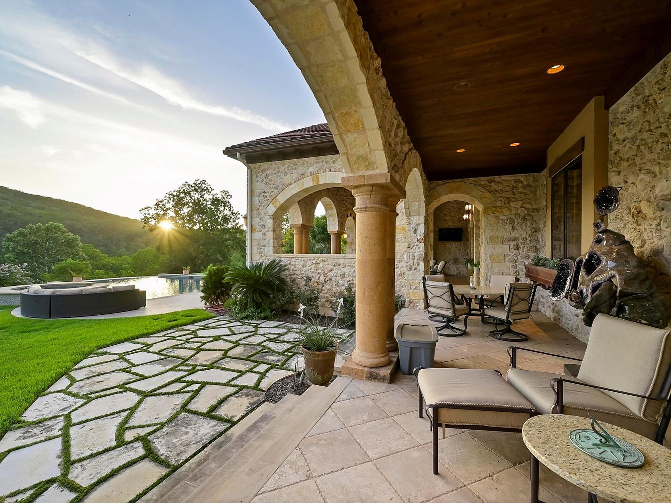 This inviting stone patio seamlessly blends Mediterranean elegance with family functionality. Thick stone columns and textured limestone walls create a timeless look, while the warm wooden ceiling adds depth and coziness to the space. Comfortable seating is thoughtfully organized for both relaxation and conversation, and a large lounger offers a perfect spot to unwind with a book or enjoy the scenery. The lush landscaping and patterned stone pathway connect the patio to a scenic pool area, great for children’s play or hosting family gatherings. Earth-toned hues complement the natural surroundings, setting a tranquil mood for outdoor living.