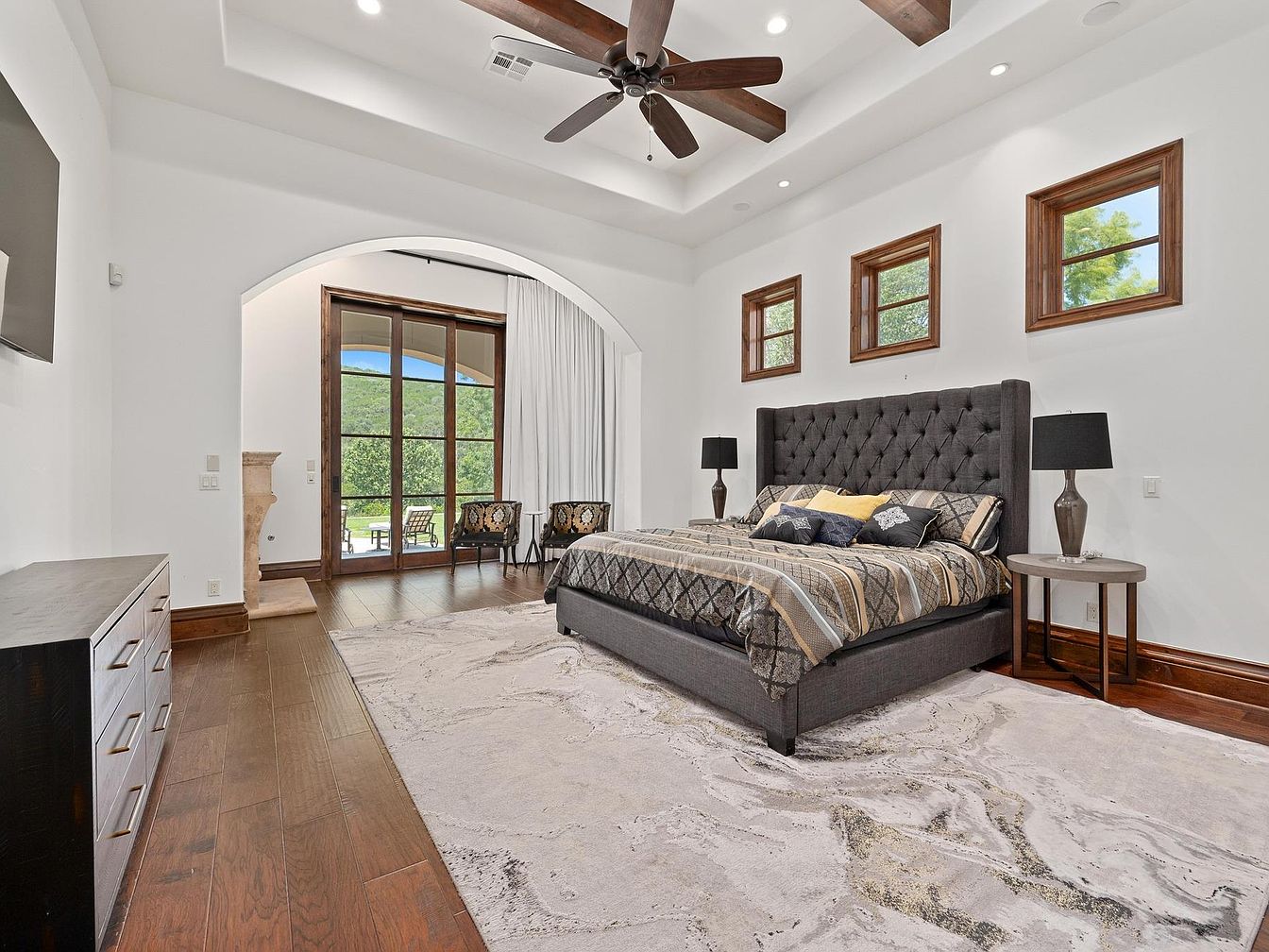 This spacious primary bedroom blends modern comfort with classic architectural elements, featuring a high tray ceiling accented by dark wooden beams and a decorative ceiling fan for added style and functionality. Rich hardwood floors pair harmoniously with crisp white walls, creating a warm yet airy atmosphere. Large windows and glass French doors fill the room with natural light, offering direct views and access to the serene outdoor space, perfect for families who enjoy indoor-outdoor living. A plush king-sized bed with a tufted headboard anchors the room, complemented by contemporary furniture, elegant accent lighting, and a soft marbled area rug for added coziness and family-friendly appeal.