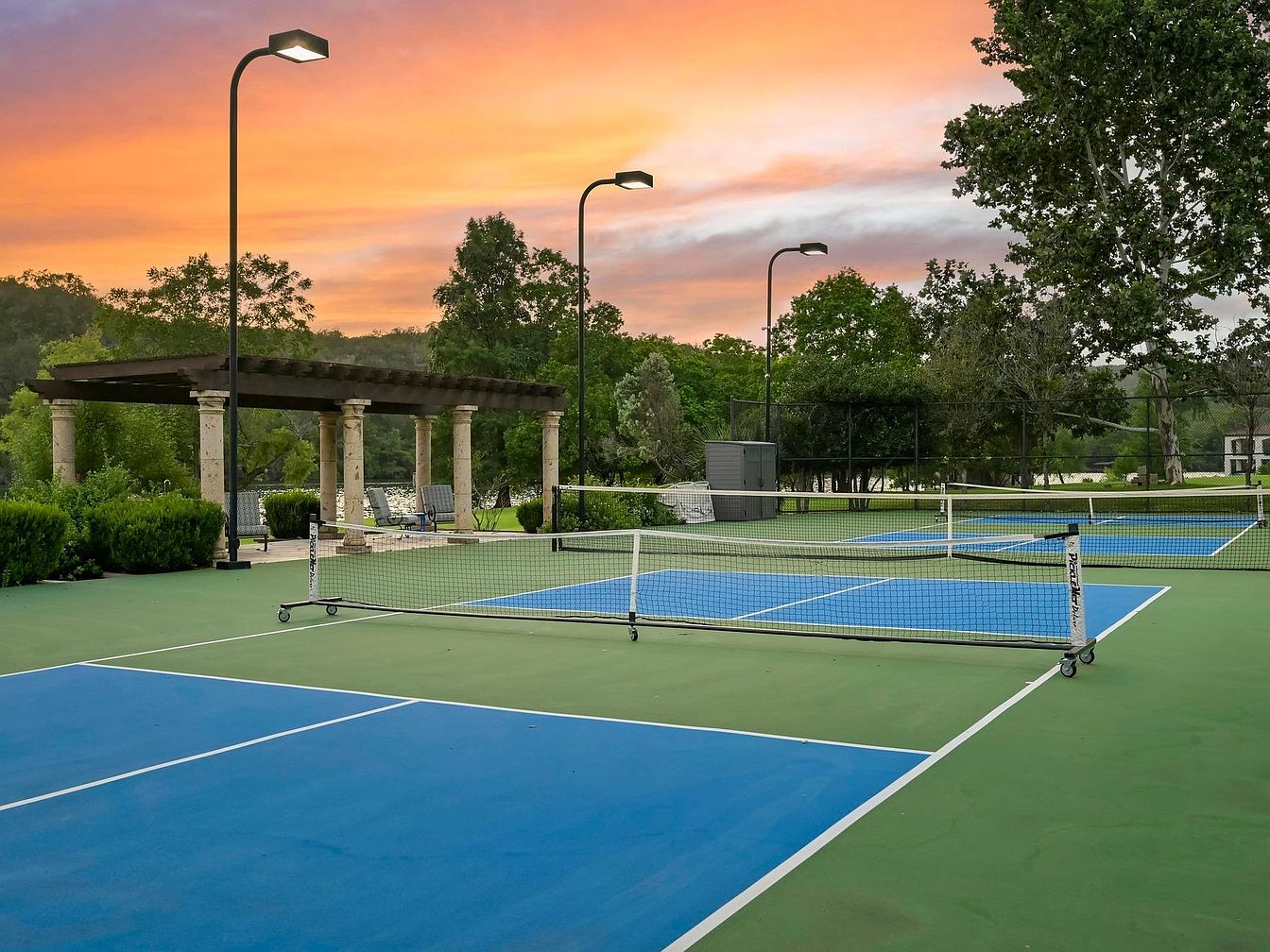 Brightly colored tennis and pickleball courts are set against a lush landscape, framed by mature trees and manicured shrubs. The area is well-lit with modern lamp posts, ideal for evening play and family gatherings. A classic pergola supported by stone columns provides a shaded seating area, perfect for spectators or a relaxed retreat after a game. The surrounding greenery not only adds beauty but also ensures privacy and a tranquil setting. This expansive recreational space exemplifies active, family-friendly living, offering a seamless blend of nature and outdoor entertainment for residents of all ages.