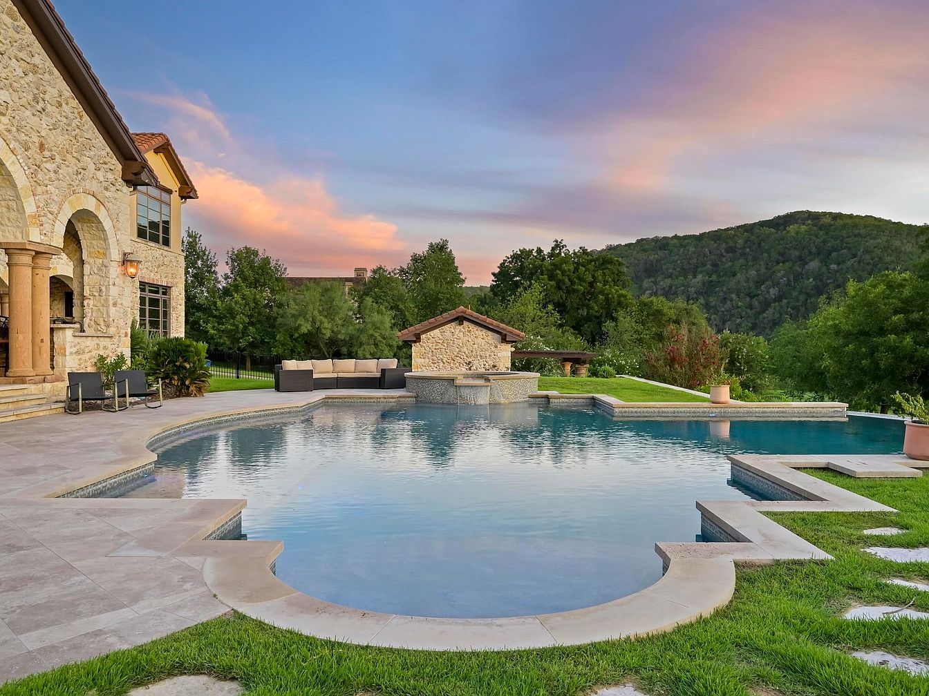 A Mediterranean-inspired backyard oasis offers a luxurious and inviting setting for family relaxation and entertaining. The sculpted swimming pool features a spacious layout with geometric curves and a built-in spa, blending seamlessly into expansive stone tile decking that encourages effortless indoor-outdoor living. Surrounding the pool, comfortable wicker seating provides ample gathering space for adults while open grassy patches offer a play area for children. Warm-toned stone arches of the home’s exterior harmonize with the terracotta roof and natural landscape, while lush greenery and rolling hills in the background create a tranquil, scenic backdrop perfect for memorable gatherings and peaceful evenings.