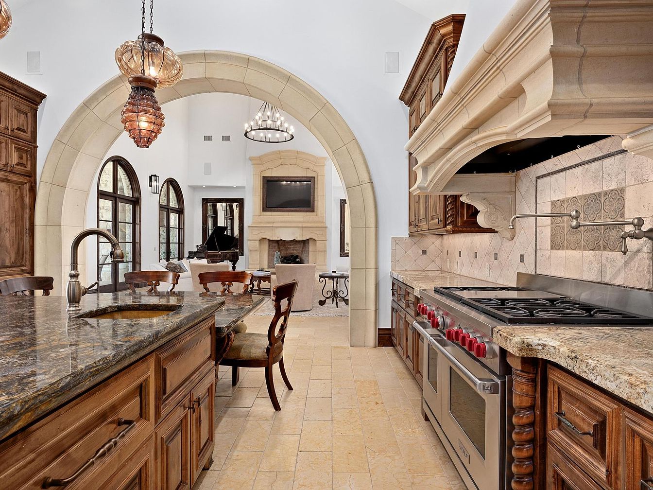 An inviting open-concept kitchen flows seamlessly into a cozy living area, separated by a grand stone archway for a sense of architectural elegance. The kitchen features luxurious granite countertops, handcrafted wooden cabinetry, and a professional-grade stove perfect for family meals. Warm, earthy tones are complemented by natural stone tile flooring and textured tile backsplash. Large arched windows bathe the space in natural light, creating a bright and welcoming atmosphere. The island with ample seating encourages family gatherings, while pendant lighting adds sophistication. Beyond the kitchen, a spacious family room with a classic fireplace and elegant décor completes this functional and inviting space.