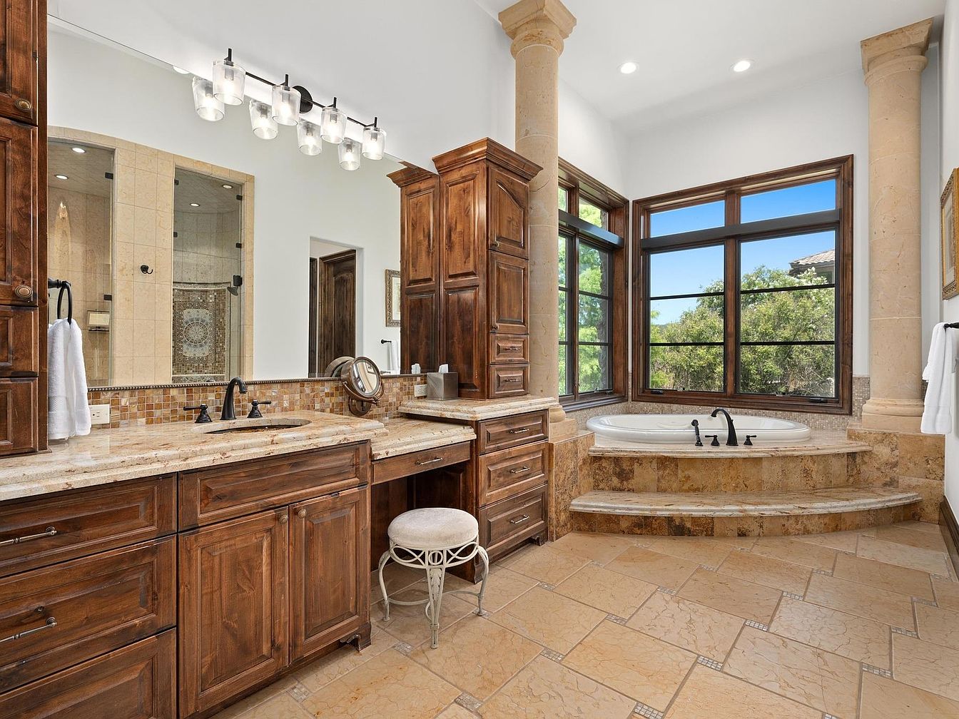 A spacious master bathroom filled with warmth and elegance, featuring rich wooden cabinetry, granite countertops, and a built-in vanity area with a cushioned stool, a perfect spot for family routines or personal care. The inviting sunken tub is highlighted by grand stone columns, natural stone tile steps, and large picture windows that fill the space with natural light and offer serene outdoor views. Neutral, earthy tones in tilework and mosaic accents create a calming atmosphere. The modern walk-in shower and ample storage ensure this bathroom supports comfort and convenience for families while providing a tranquil, spa-like retreat.