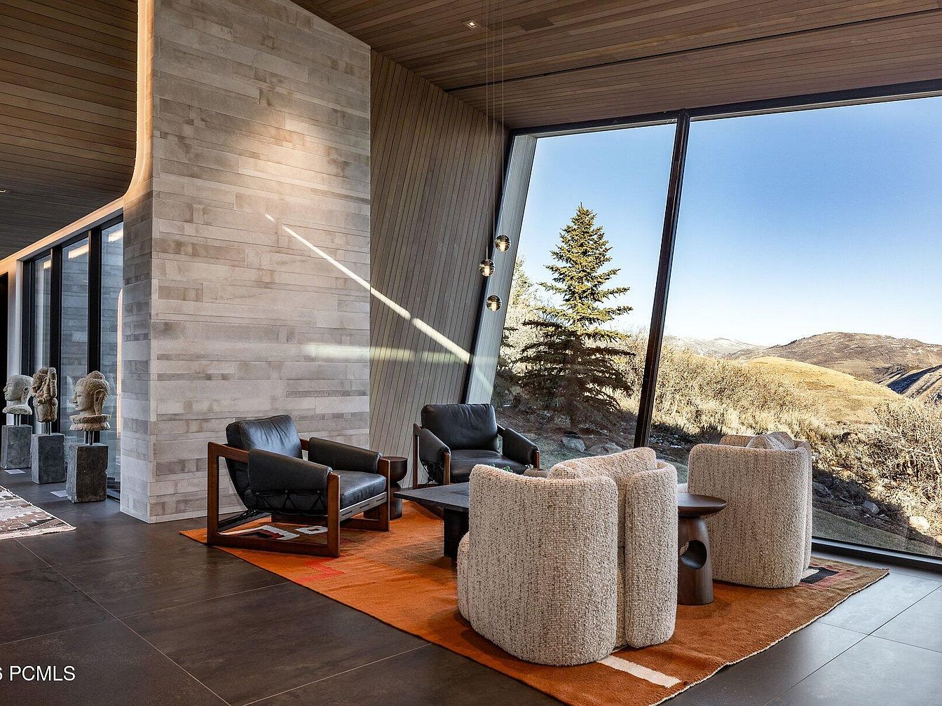This modern living space features a stunning open layout with expansive floor-to-ceiling windows, creating a seamless connection to the breathtaking outdoor landscape. The room is anchored by a textured stone wall, providing a sophisticated backdrop. A warm color palette of earthy shades is complemented by a cozy, orange area rug that defines the seating area. The furnishings include sleek leather armchairs and comfy, rounded accent chairs, perfect for family gatherings. Unique art pieces on pedestal stands add character, while stylish lighting fixtures cast a warm glow, enhancing the inviting atmosphere tailored for relaxation and conversation.