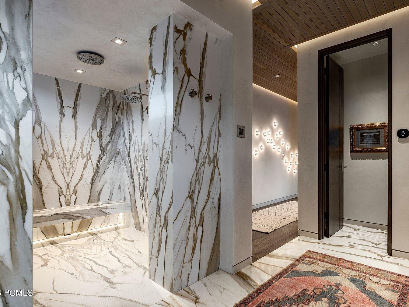 This luxurious shower area embodies modern elegance with its stunning marble walls featuring dramatic gold veining. The seamless layout offers a spacious feel, enhanced by ambient recessed lighting that illuminates the delicate texture of the stone. A strategically placed bench provides a practical touch, perfect for relaxation. The open glass shower design enhances accessibility, catering to all family members, while the rich wooden ceiling adds warmth and sophistication. The thoughtfully designed aesthetic flows into a welcoming entryway, complete with soft area rugs and artistic wall features, creating a harmonious transition between spaces that invites comfort and style.