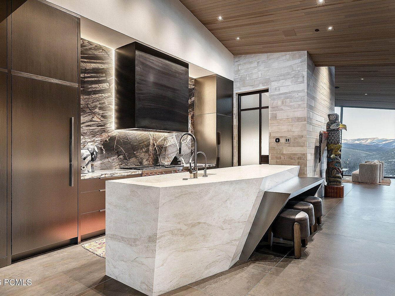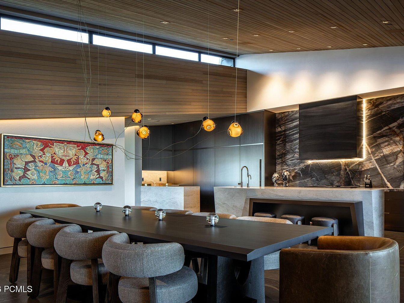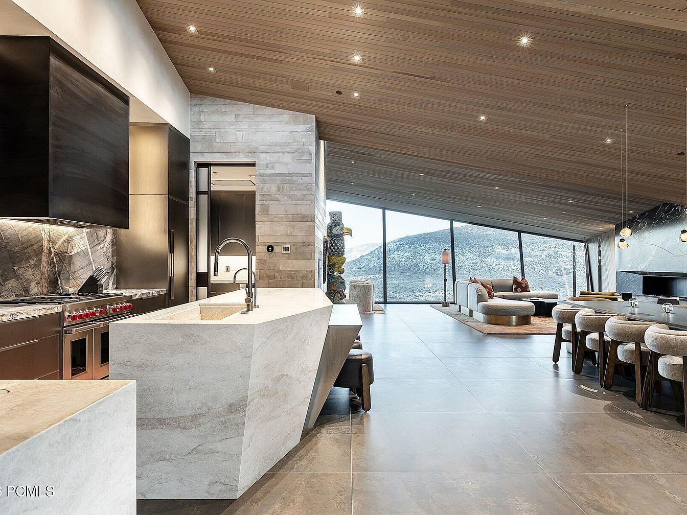 This open concept kitchen seamlessly integrates with the adjoining living area, showcasing sleek stone countertops and cutting-edge appliances that redefine modern cooking. The innovative geometric island serves as both a functional space and a visual centerpiece, promoting interaction during meal preparations. A warm wood ceiling adds a cozy touch, contrasting beautifully with the cool-toned cabinetry and stunning marble backsplash. Ample natural light floods through expansive windows, offering breathtaking mountain views. Family-friendly features like spacious dining options and comfortable lounge seating enhance social gatherings, while the neutral color palette ensures a harmonious and inviting atmosphere throughout.