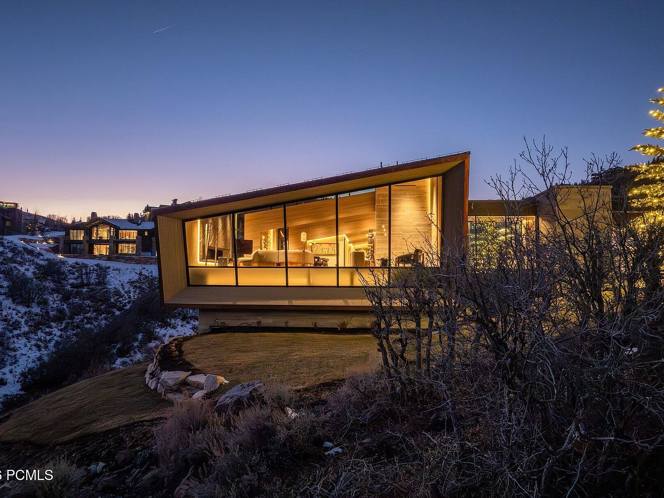 Showcasing a stunning modern home, this architectural marvel features a striking angular design with expansive glass walls. Nestled on a hillside, the structure offers panoramic views of the surrounding landscape and a warm ambiance with interior lighting visible through its large windows. Earthy tones meld beautifully with natural materials, enhancing the inviting atmosphere. A gently sloped lawn encircles the home, making it perfect for family gatherings or outdoor activities. The combination of sleek wood paneling and stone accents creates a harmonious balance between contemporary aesthetics and traditional comfort, inviting you to envision a tranquil retreat.