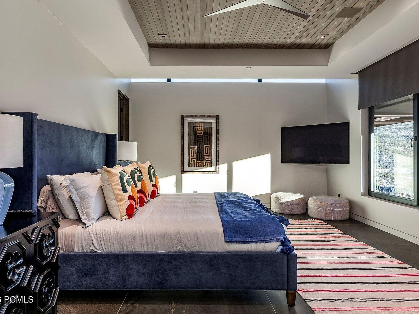 This serene master bedroom presents a perfect blend of modern design and comfort. The spacious layout features a plush king-sized bed adorned with colorful throw pillows, enhancing both style and comfort. Light pours in through expansive windows, illuminating the sleek, polished concrete floors and accentuating the wooden ceiling which adds warmth. A cozy area rug with soft tones pulls the room together, creating a welcoming atmosphere. Minimalist bedside lamps and a contemporary dresser with intricate detailing provide functional elegance. The thoughtfully positioned TV offers a touch of modern convenience, making this space ideal for relaxation and restful nights.