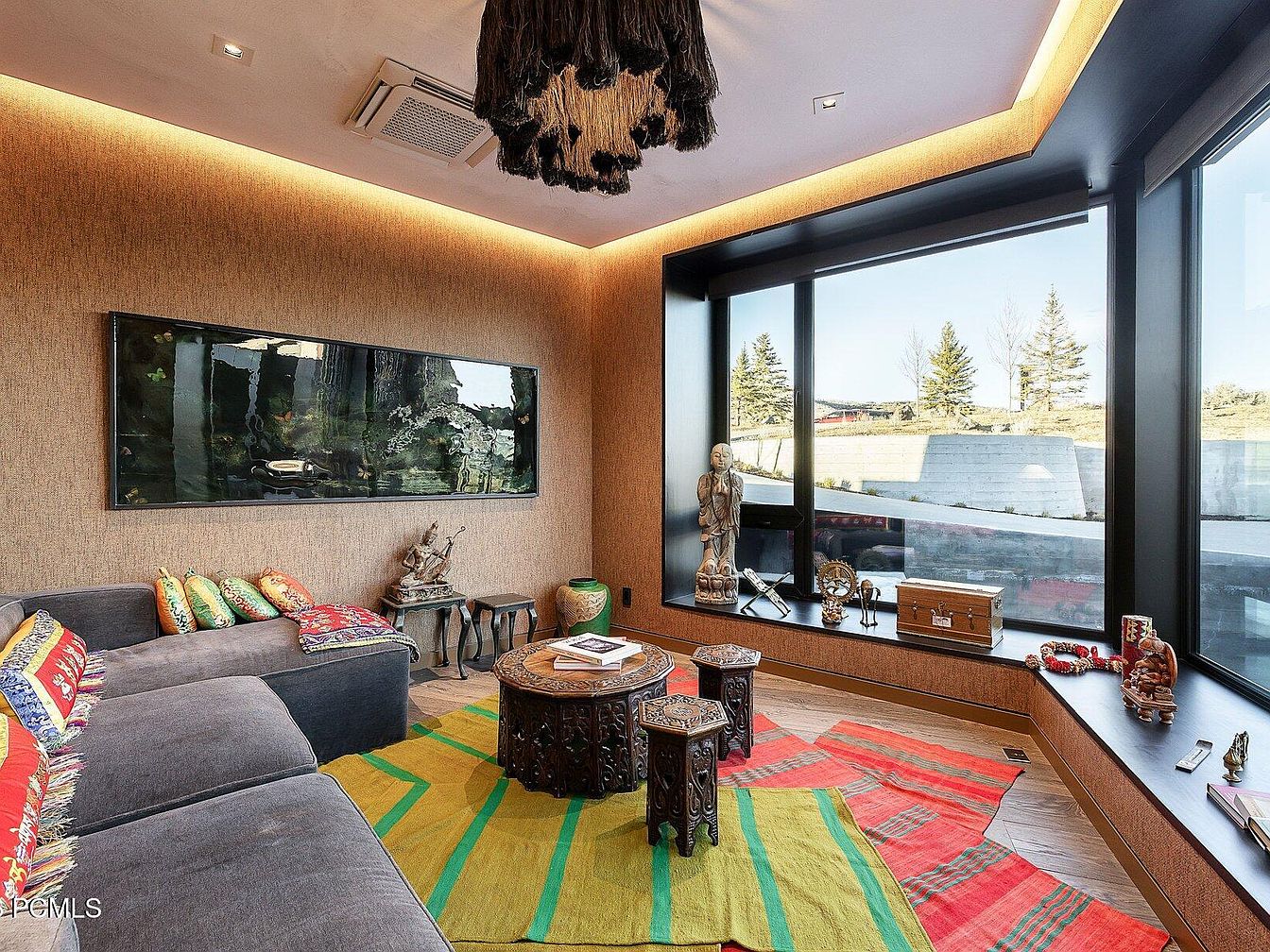 This inviting sitting area combines comfort and artistic flair. A plush gray sectional adorned with vibrant, patterned cushions provides ample seating, perfect for family gatherings or quiet evenings. The striking area rug, with bold green and orange stripes, adds warmth and color to the natural wood floor. Illuminated by innovative lighting along the ceiling, textural wallpaper complements the wall-mounted artwork, enhancing the room’s aesthetic. Large windows frame the serene outdoor views while allowing natural light to flood the space. Unique decor pieces, including wooden sculptures and colorful artifacts, contribute a personal touch, creating a welcoming and vibrant environment.