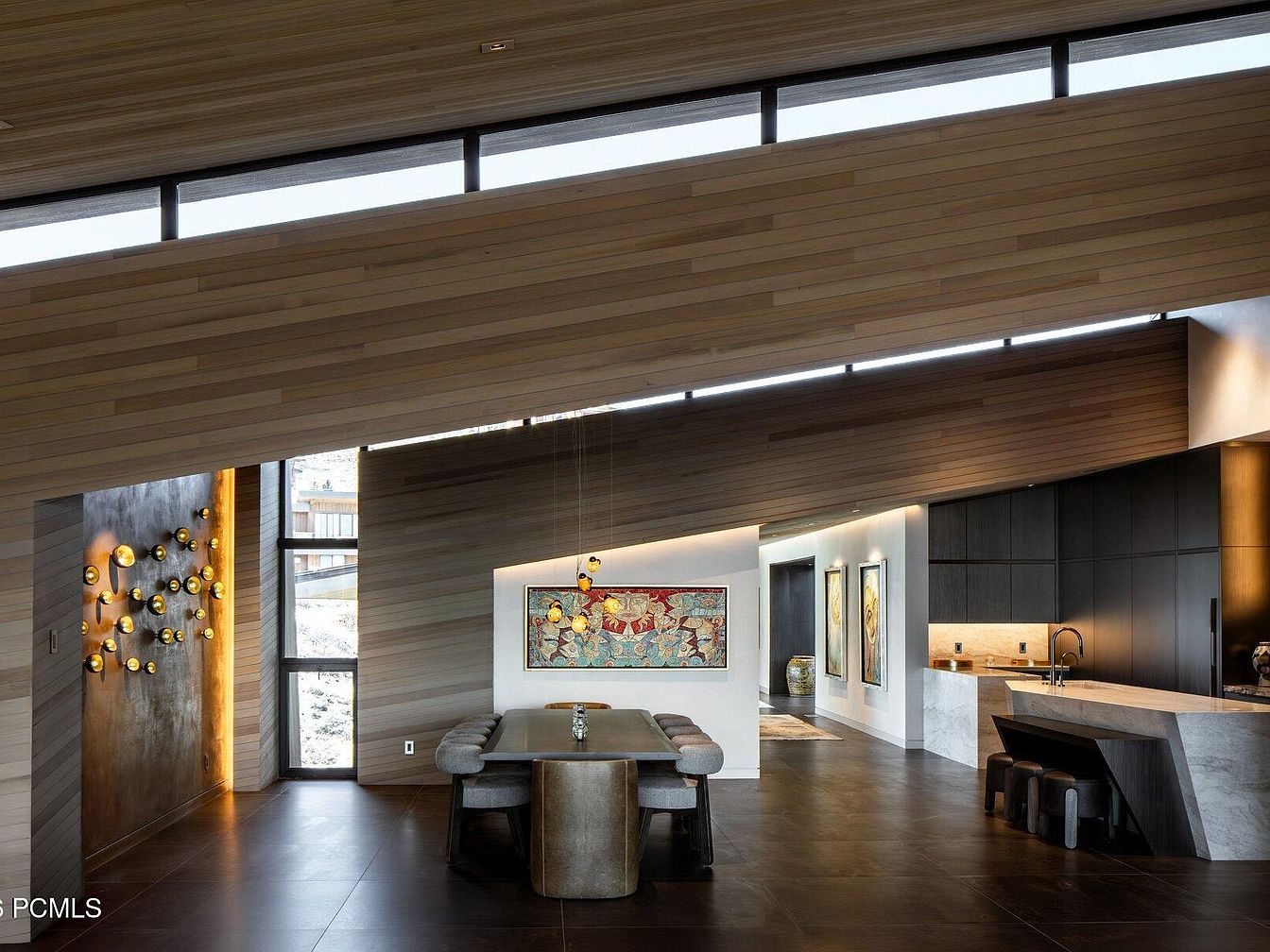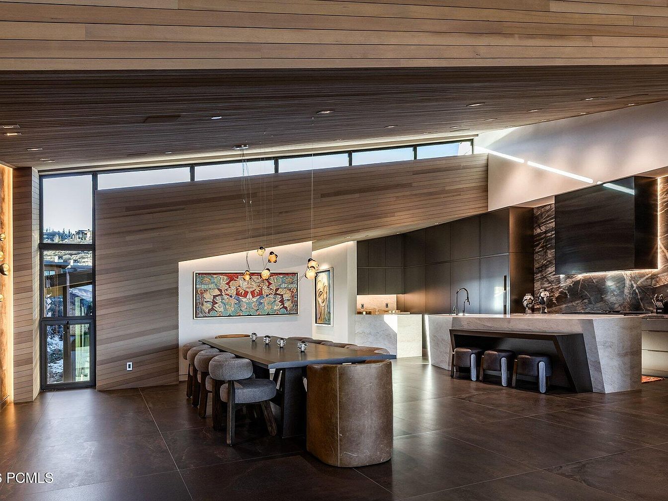 This striking modern dining area showcases a seamless blend of sleek design and comfort. The layout features a large, polished dining table complemented by upholstered chairs, perfect for family gatherings. The room’s warm color palette, with rich browns and soft neutrals, creates an inviting atmosphere. Unique wall art adds character, while sculptural lighting fixtures cast a warm glow, enhancing the ambiance. Architectural details like the angled wooden ceiling and large windows allow natural light to flood the space, celebrating the outdoors. Practical elements, such as close proximity to the kitchen, make it both functional and stylish.