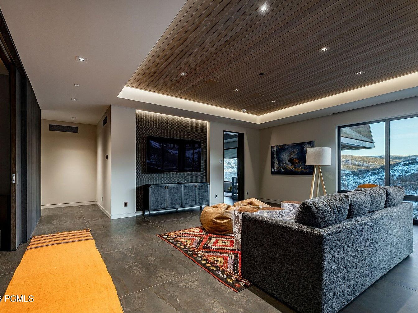 This modern living space features a harmonious blend of comfort and elegance. The open layout is accentuated by a chic gray sectional sofa, inviting relaxation. Rich textures abound, from the wood-paneled ceiling to the sleek stone flooring, while warm accent colors from the vibrant rug and yellow runner add visual interest. A minimalist media console houses the TV, surrounded by art pieces that add character. Large windows frame stunning outdoor views, ensuring natural light floods in, enhancing the atmosphere. Family-friendly elements like bean bag chairs create a playful touch, making it a perfect gathering spot for all.