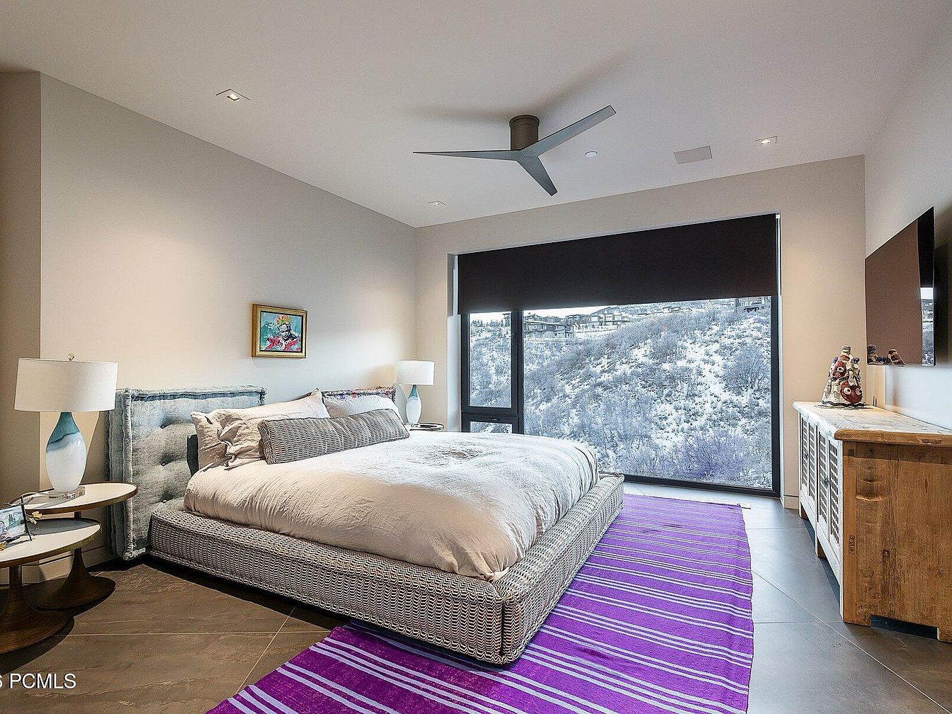 This master bedroom offers a serene and modern aesthetic with its spacious layout and minimalist design. A king-sized bed featuring a textured headboard sits centrally, flanked by stylish side tables with contemporary lamps that provide soft lighting. The color palette combines neutral tones with a vibrant purple striped rug, adding playful warmth to the environment. Large windows capture breathtaking views, accented by sleek black shades for privacy. A flat-screen TV integrates seamlessly into the décor, while an artisanal wooden chest enhances storage and charm. The room’s clean lines and elegant furnishings create a tranquil retreat, perfect for relaxation.