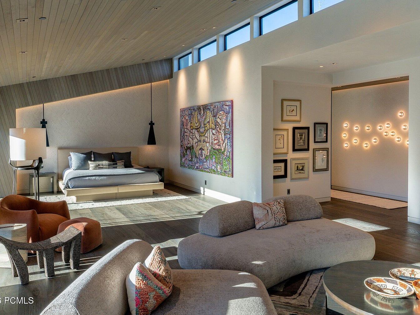 This luxurious master bedroom features a spacious layout with a tranquil ambiance, highlighted by elegant wooden ceiling beams and expansive windows that flood the room with natural light. The warm gray color scheme creates a soothing atmosphere, complemented by plush bedding and a contemporary platform bed. Family-friendly elements abound, such as cozy ergonomically designed furniture in inviting textures. A striking piece of artwork serves as a vibrant focal point, while stylish framed photographs add a personal touch. The clever use of accent lighting enhances the room’s architectural details, making this space an ideal sanctuary for relaxation and rejuvenation.