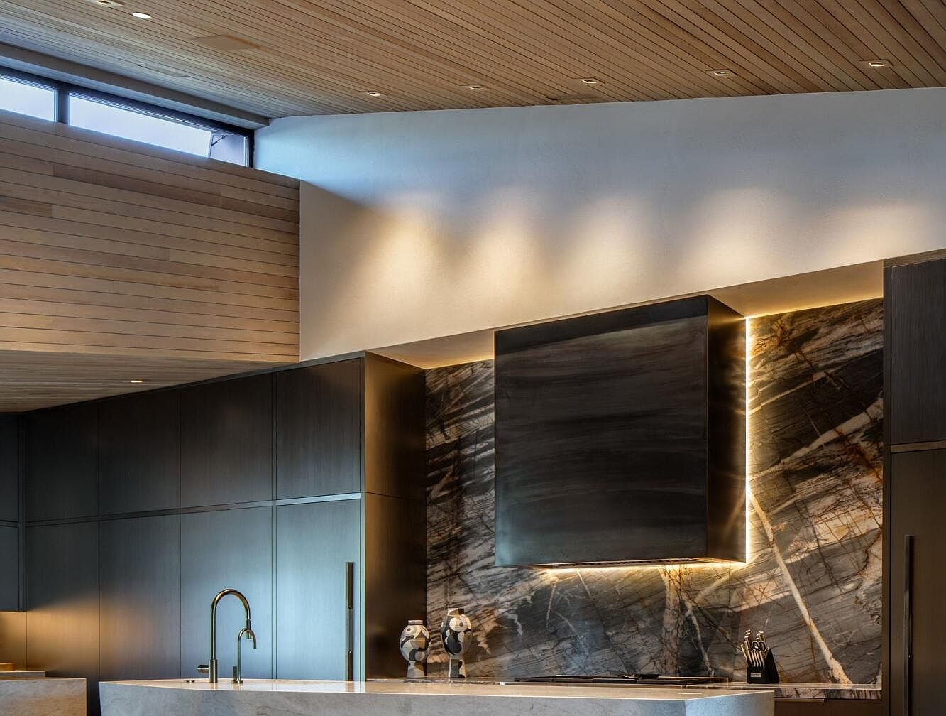 This modern kitchen features a sleek layout with a blend of dark and light materials, creating an inviting atmosphere. The beautiful wooden ceiling enhances the spacious feel, beautifully contrasting with the dark cabinetry. A striking stone backsplash, with its rich veining, serves as a focal point, illuminated by subtle LED lighting. Minimalist fixtures and a high-end faucet combine functionality with style, ensuring easy use for families. Open windows allow natural light to flood the space, making it bright and welcoming. Clean lines and contemporary design elements make this kitchen a perfect hub for family gatherings and daily life.