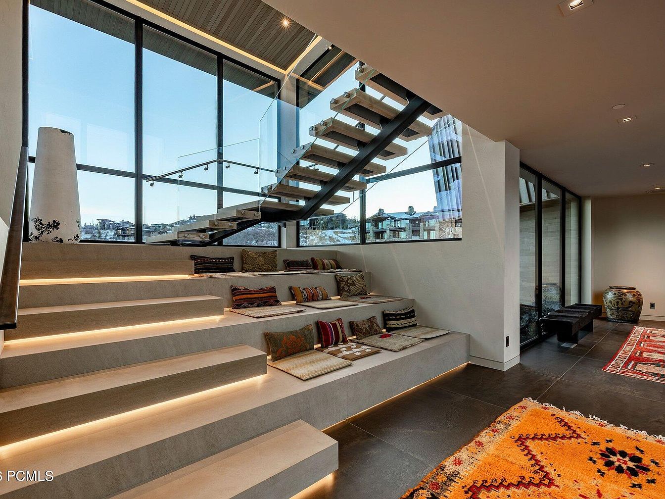 This modern family room features a stunning open layout, with expansive floor-to-ceiling windows allowing natural light to flood the space. The tiered seating area, framed by sleek concrete steps, is both inviting and practical, perfect for family gatherings and casual lounging. The warm color palette is highlighted by vibrant rugs, contrasting with the neutral tones of the walls and flooring. A prominent glass staircase adds architectural interest, while cozy cushions provide comfort and style. Thoughtfully chosen decor elements enhance a relaxed yet contemporary vibe, making this a perfect setting for both relaxation and socializing.