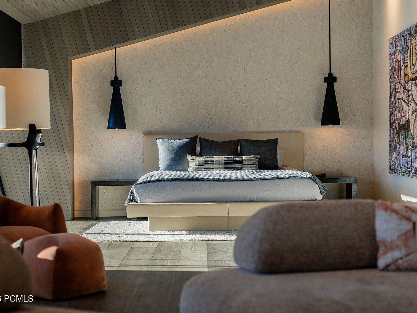 This master bedroom exudes a serene and modern aesthetic, featuring soft neutral tones that create a calming atmosphere. A plush bed, accented with cozy throw pillows and textured bedding, takes center stage against a minimalist backdrop with stylish wall paneling. Elegant pendant lights hang above nightstands, adding functional yet chic illumination. The cleverly placed artwork injects color and personality, contrasting beautifully with the warm wood flooring. A cozy reading nook, formed by plush armchairs, invites relaxation. This space is designed for tranquility, reflecting a family-friendly environment that balances comfort with contemporary design.