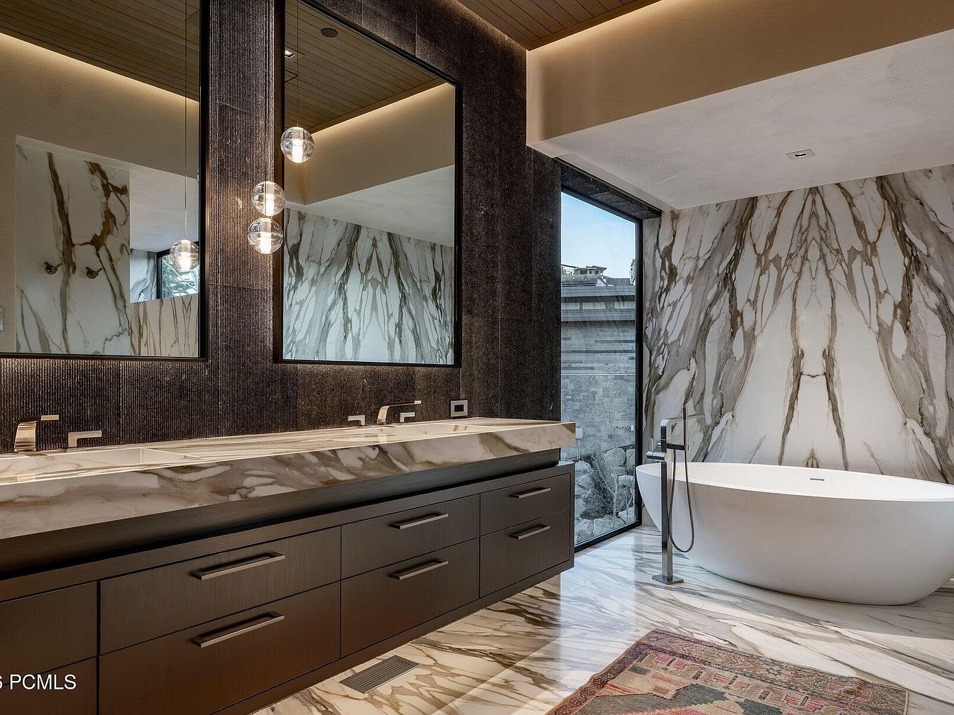 This stunning master bathroom features a beautifully designed layout that promotes a sense of serenity and elegance. A sleek, double vanity with a rich, dark finish complements the luxurious marble countertops, while the striking wall-mounted mirrors add depth and sophistication. The space is enhanced by soft ambient lighting, casting a warm glow against the polished marble walls that boast intricate veining, creating a stunning focal point. A free-standing soaking tub invites relaxation, positioned next to expansive windows that allow natural light to flood the room. Detailed finishes, including modern fixtures and a decorative rug, further elevate the ambiance.