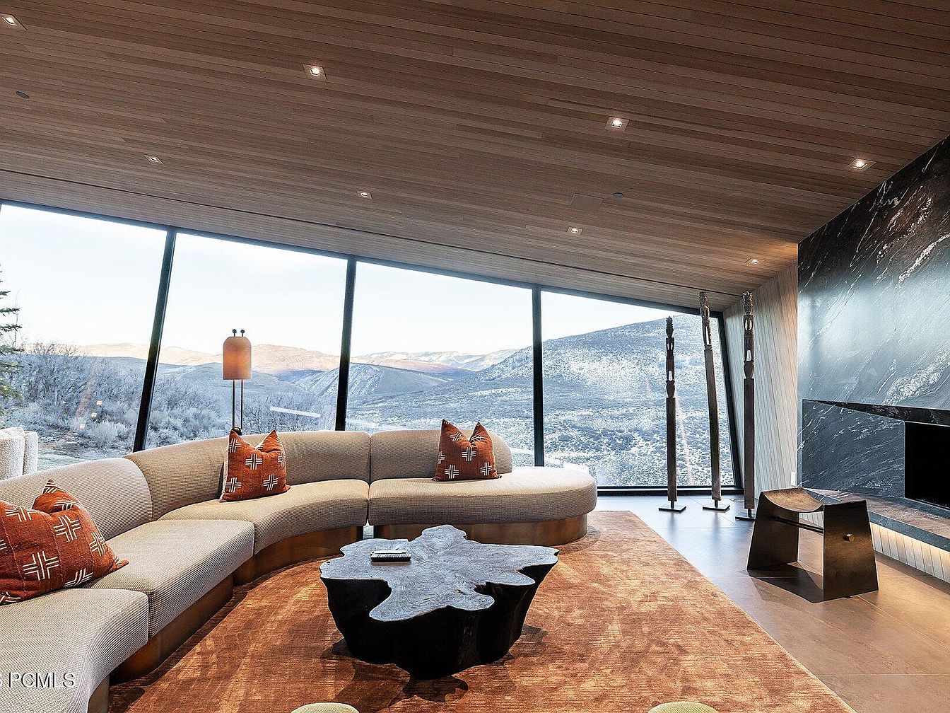 This modern living room features a seamless blend of luxurious comfort and natural beauty, highlighted by a sweeping view of the mountains through expansive glass windows. A spacious, curved sectional sofa invites relaxation, adorned with vibrant, patterned pillows that add a pop of color. The warm wood ceiling beautifully contrasts with the dark marble accent wall, creating a sophisticated ambiance. A unique, organic-shaped coffee table anchors the space, complemented by a rich area rug that adds warmth underfoot. Minimalist decor, including artistic sculptures, enhances the room’s contemporary feel, making it perfect for family gatherings or quiet evenings.