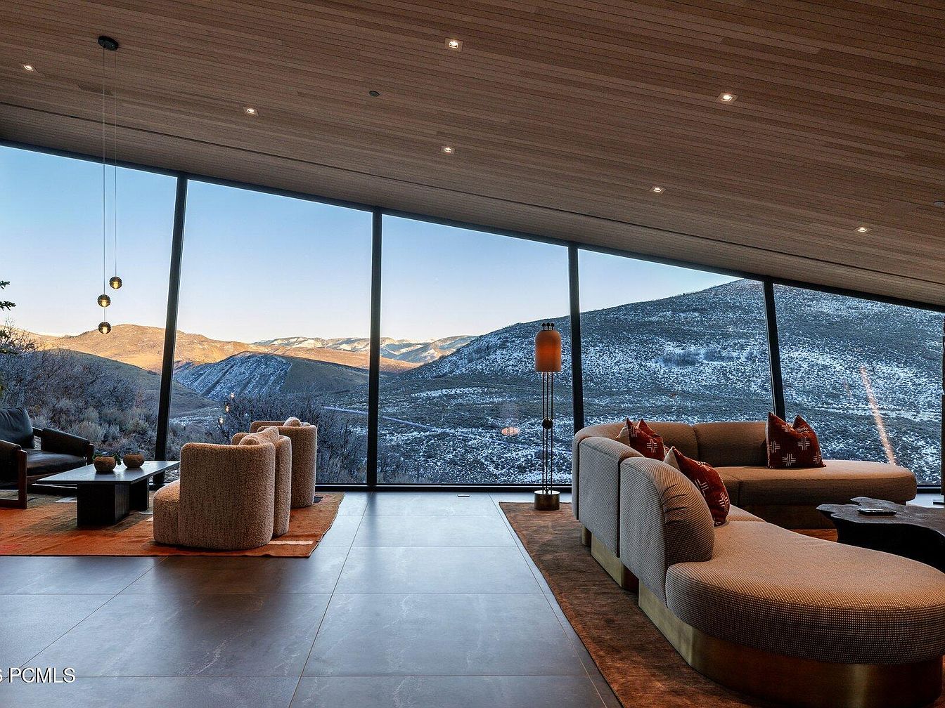 This stunning living room offers breathtaking panoramic views of the surrounding mountains through floor-to-ceiling glass walls. The layout maximizes space, featuring a cozy sectional sofa paired with plush armchairs, perfect for family gatherings. Earthy tones and natural textures create a warm and inviting atmosphere, while the hardwood ceiling adds an elegant touch. A soft area rug anchors the seating area, complemented by a sleek coffee table. The modern pendant lighting and minimalist decor enhance the contemporary aesthetic, integrating seamlessly with the outdoors. This space is designed for comfort and connection, providing an ideal retreat for relaxation and entertaining.
