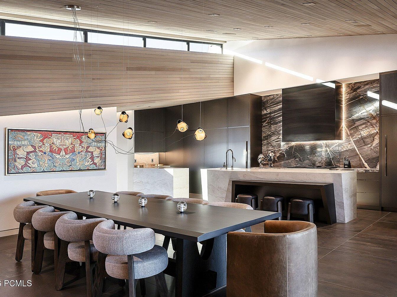 A spacious dining area features a striking long table complemented by plush, rounded chairs that invite family gatherings. The color palette balances rich earth tones with light neutrals, creating a warm and inviting atmosphere. Vertical wooden panels on the ceiling enhance the height and openness, while strategically placed pendant lights add a contemporary touch. The sleek cabinetry and bold marble backsplash in the adjoining kitchen introduce an element of sophistication. A vibrant piece of artwork adorns the wall, adding character and a splash of color, ensuring this space is perfect for both intimate dinners and festive celebrations.
