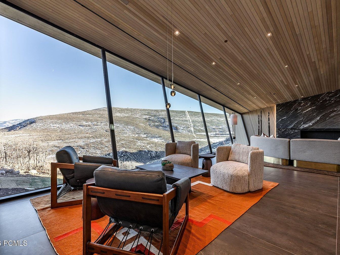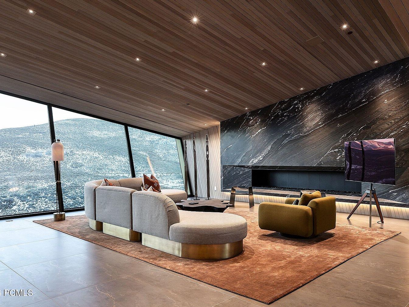 This sophisticated living room features an open layout that seamlessly integrates with its breathtaking mountain views. The sleek, angled floor-to-ceiling windows invite natural light while framing a stunning landscape. A rich color palette combines soft neutrals with earthy tones, showcased through stylish furniture selections. The curved, contemporary sofas are adorned with plush cushions, complemented by an inviting accent chair. Warm wood paneling on the ceiling adds depth and texture, while the large, marbled accent wall boasts a modern fireplace, serving as a captivating focal point. A plush area rug anchors the space, enhancing its family-friendly atmosphere.