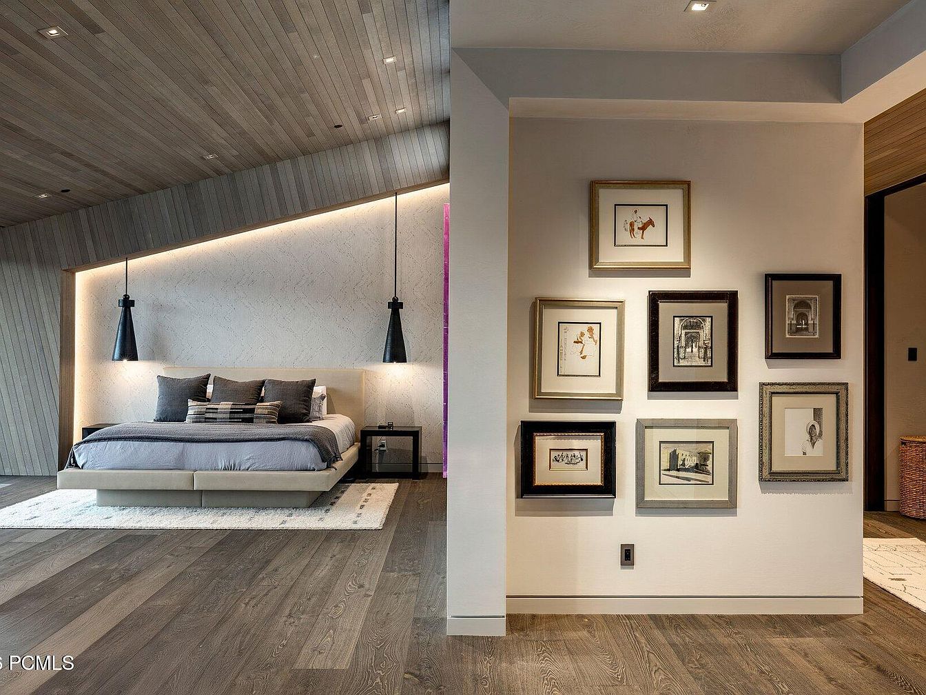 A spacious master bedroom features a harmonious blend of modern and cozy aesthetics. Warm wood paneling graces the ceiling, creating texture and warmth in the room. The platform bed, adorned with plush gray bedding and patterned accent pillows, invites relaxation. Minimalist black pendant lights provide subtle lighting, accentuating the soothing ambiance. A soft area rug anchors the furniture and adds visual comfort to the hardwood floor. The adjacent wall showcases a curated gallery of framed art, merging personal expression with sophisticated design. This layout promotes a serene retreat, perfect for unwinding or quality family time.