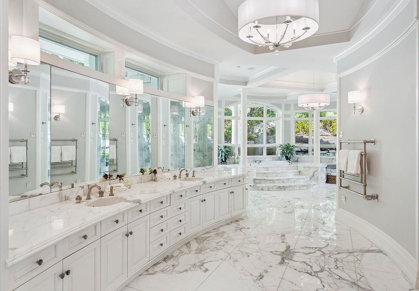 This stunning bathroom combines elegance with functionality, featuring a spacious double vanity adorned with beautiful white marble countertops and stylish fixtures. The curved layout adds a unique charm, while large mirrors enhance the sense of space. Soft, ambient lighting from modern sconces and sleek overhead chandeliers illuminates the room, creating a serene atmosphere. The open design offers views of the outdoor landscape through expansive windows, inviting natural light and greenery inside. A marble floor and tasteful decor elements ensure comfort and sophistication, making this bathroom a perfect family-friendly oasis for relaxation and rejuvenation.