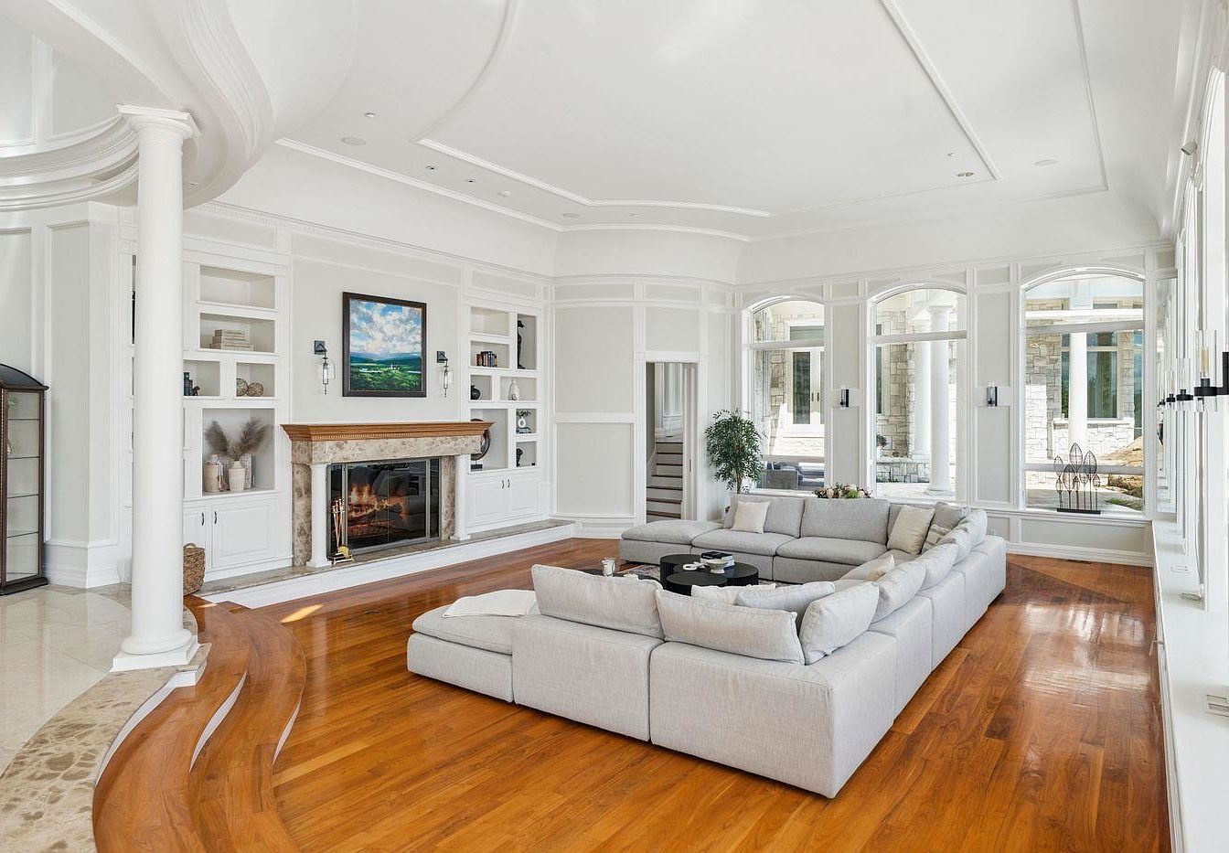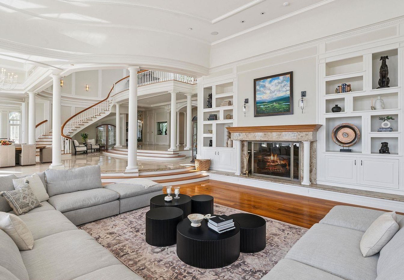 A stunning living room showcases an open layout that emphasizes elegance and comfort. The room features a contemporary gray sectional sofa, accented with plush pillows, inviting relaxation. A trio of black, round coffee tables adds a modern flair, while a soft area rug anchors the seating arrangement. The polished wooden flooring reflects natural light, enhancing the airy atmosphere. Architectural details include grand columns and a sweeping staircase, leading to upper levels. Built-in bookshelves provide functional storage and display space, complemented by tasteful artwork above the marble fireplace. Soft neutral tones create a tranquil and family-friendly environment.