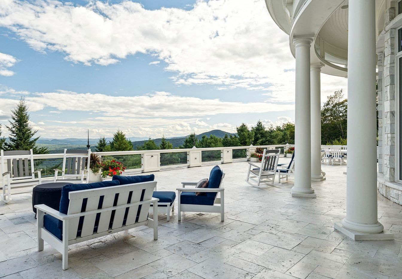 A stunning patio designed for relaxation and entertainment, featuring elegant white furniture contrasting beautifully with deep blue cushions. The spacious layout is accented by grand pillars that frame the panoramic mountain views, inviting the outdoors in. The stone flooring exudes a sophisticated charm while ensuring durability and ease of maintenance. Surrounded by lush greenery and colorful flower arrangements, this space is perfect for family gatherings or quiet evenings. Ample seating encourages conversation, and the serene atmosphere created by the gentle breeze adds to its allure, making this patio an ideal sanctuary for all seasons.