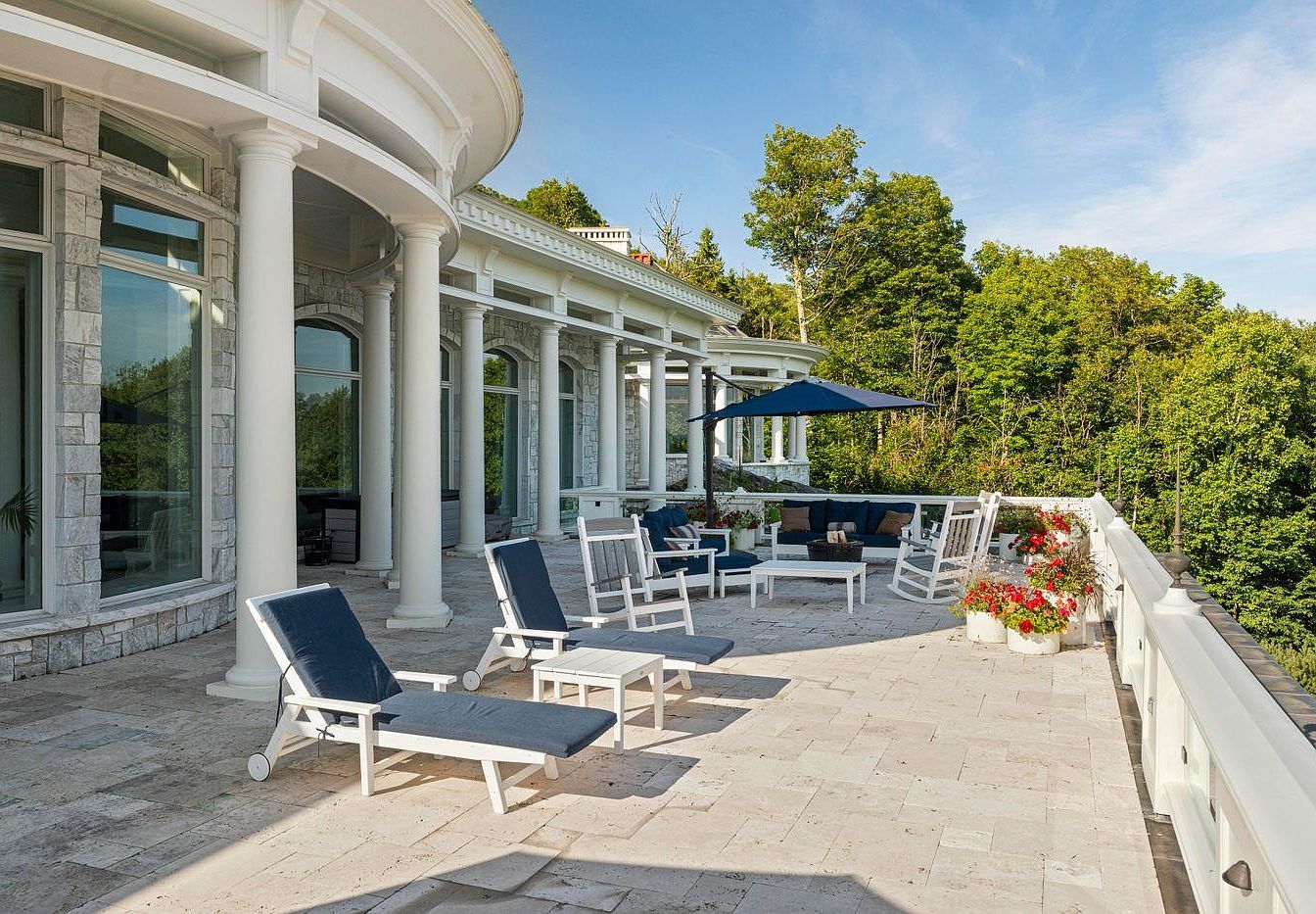 This stunning outdoor patio blends elegance and comfort, ideal for gatherings or tranquil evenings. The space features a spacious layout, highlighted by magnificent columns and expansive windows that invite natural light. A combination of navy and white lounge chairs complements the modern furnishings, while a large umbrella provides shade over a cozy seating area adorned with plush cushions. The stone flooring adds a rustic charm, perfectly paired with vibrant flower planters that enhance the aesthetics. Surrounded by lush greenery, this outdoor retreat serves as a family-friendly haven for relaxation and entertainment, embodying a harmonious connection with nature.