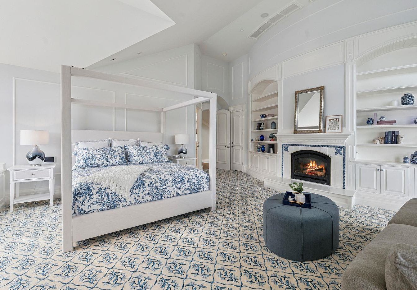 This elegant master bedroom combines sophistication with comfort, featuring a stunning four-poster bed adorned in rich blue and white patterns that echo the floral motifs in the plush area rug. A cozy fireplace adds warmth, creating an inviting atmosphere perfect for relaxation. Light-colored walls and expansive built-in shelves accentuate the room’s airy feel, while stylish bedside lamps provide soft illumination. Family-friendly elements include a spacious layout allowing for easy movement and interaction, complemented by a plush, round ottoman that functions as both seating and a decorative accent. This room serves as the perfect retreat from daily life.