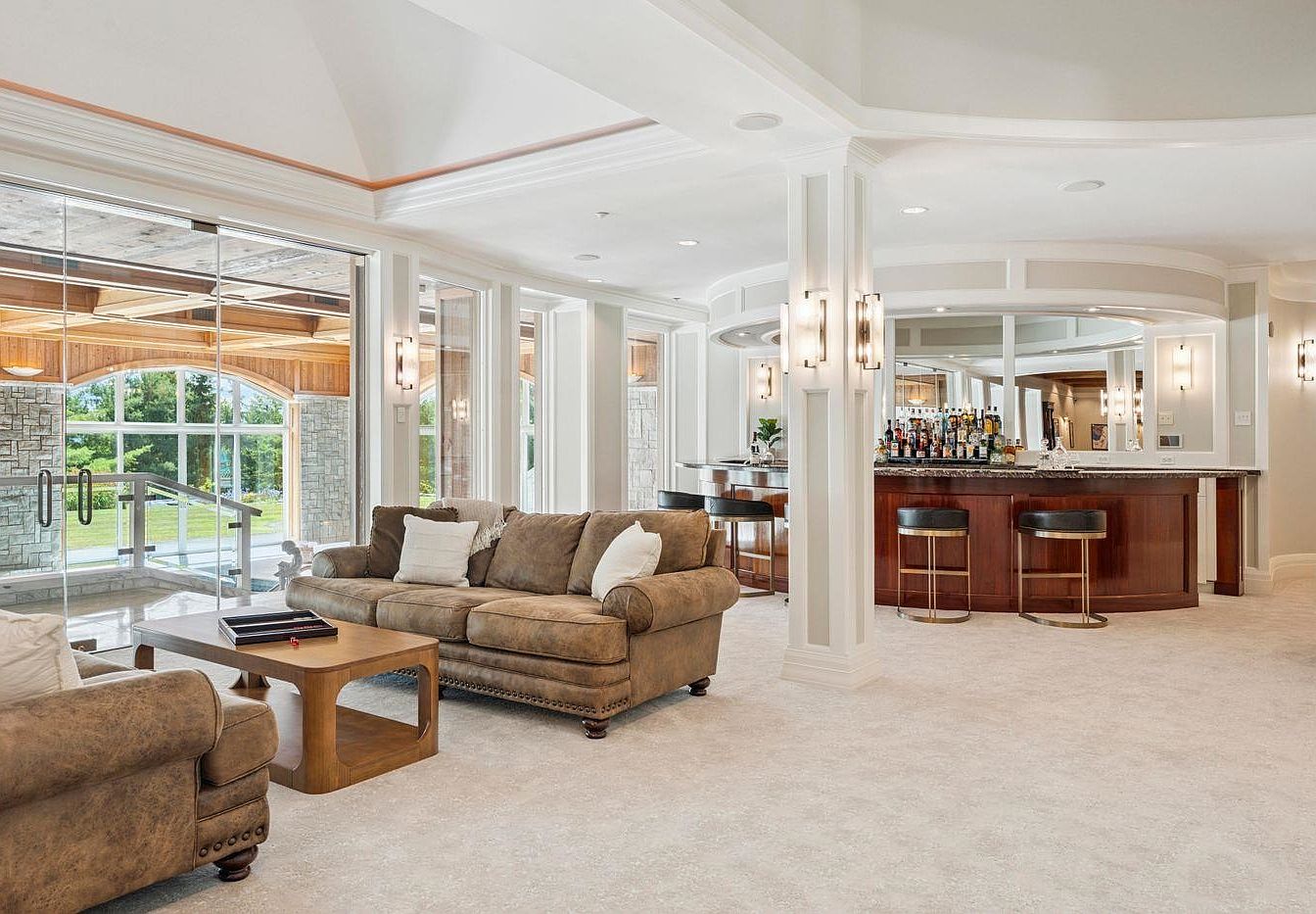 This spacious family living area seamlessly blends comfort and elegance, featuring plush, inviting sofas topped with soft pillows that beckon relaxation. The rich, earthy tones of the furniture are beautifully complemented by the warm cream carpet, creating a cozy ambiance. A stylish wooden coffee table anchors the space, while sleek bar stools surround a modern granite-topped bar in the background, perfect for entertaining guests. Large glass doors invite abundant natural light and connect the indoors with a scenic exterior view, enhancing the open feel. Architectural details, such as decorative molding and stylish lighting fixtures, further elevate the aesthetic.