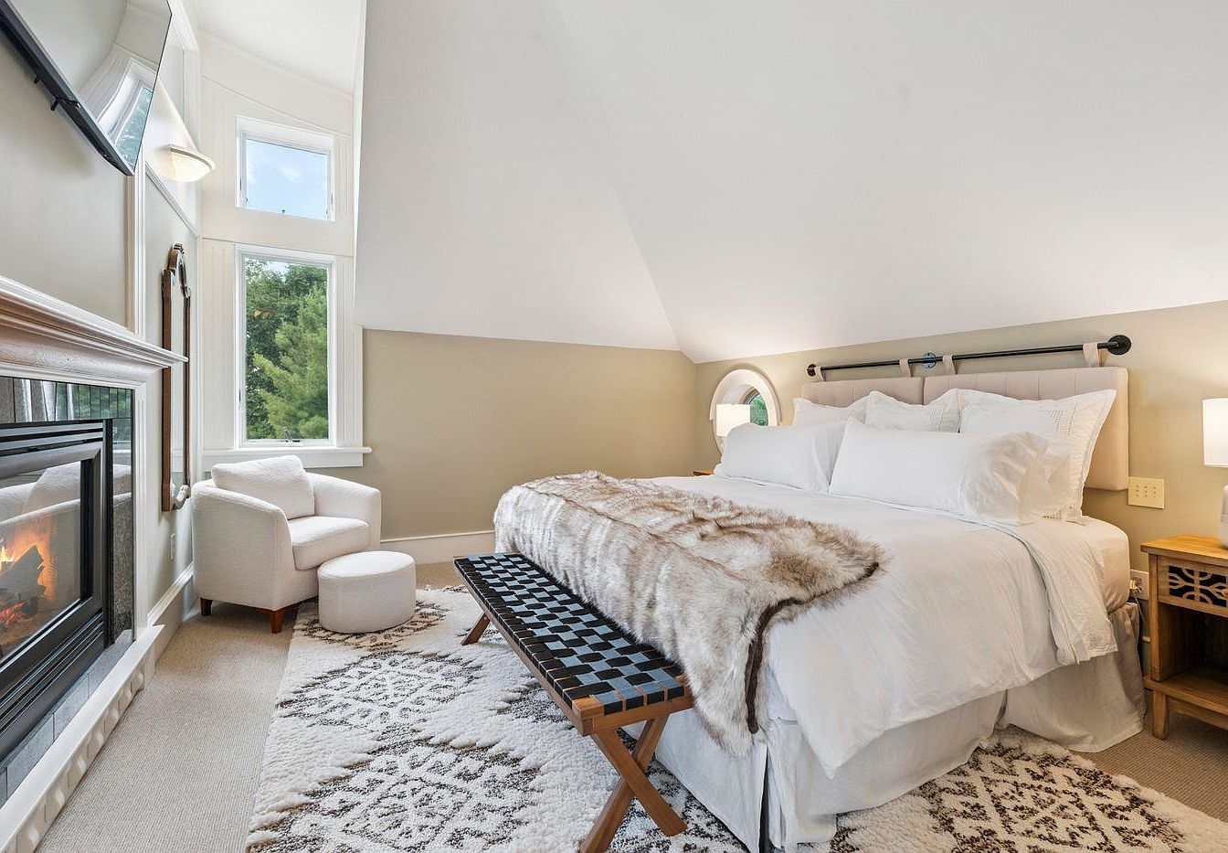 This expansive master bedroom combines elegance and comfort with a soothing color palette of soft gray and white. The vaulted ceiling enhances the spaciousness, while large windows flood the room with natural light. A cozy king-sized bed adorned with plush white linens and a chic faux fur throw invites relaxation, complemented by bedside tables featuring intricate designs. A contemporary bench at the foot adds extra seating. The seating area holds a stylish armchair and ottoman, perfect for quiet moments. The soft area rug grounds the space, creating a warm, inviting atmosphere, ideal for family comfort and restful nights.