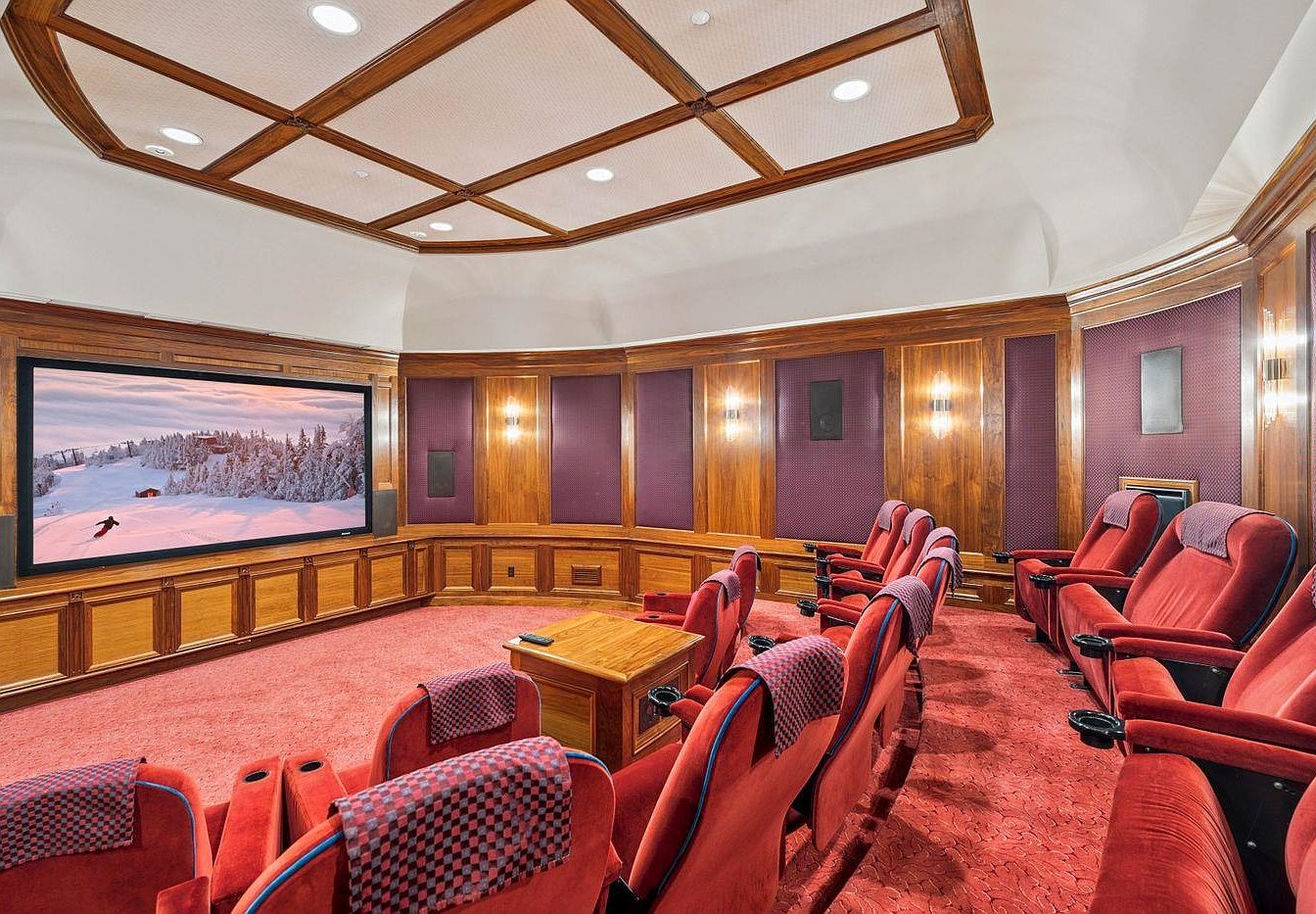 This luxurious home theater features a sophisticated circular layout that enhances the cinematic experience. Plush red seating arranged for optimal viewing faces a large projection screen, framed elegantly in dark wood. The room’s rich color scheme of deep reds and warm wood tones creates a cozy yet opulent atmosphere, perfect for family movie nights or hosting friends. Architectural details include a coffered ceiling and decorative wall treatments that absorb sound, ensuring a superior acoustical experience. Thoughtful features, such as cup holders and comfortable reclining seats, make this space inviting and ideal for relaxation and entertainment.
