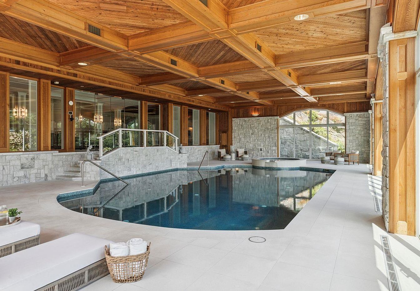 This stunning indoor pool area exudes luxury and relaxation, featuring a large, inviting swimming pool surrounded by sleek, white stone tiles. The space is enhanced by a beautiful wooden ceiling with intricate beams, which adds warmth and sophistication. Floor-to-ceiling windows flood the area with natural light, seamlessly merging indoor and outdoor vibes. A comfortable seating area, complete with plush lounge chairs and a whirlpool, invites family gatherings or quiet retreats. Soft towels neatly arranged in a woven basket emphasize the resort-like atmosphere, making this space perfect for both leisure and family enjoyment.