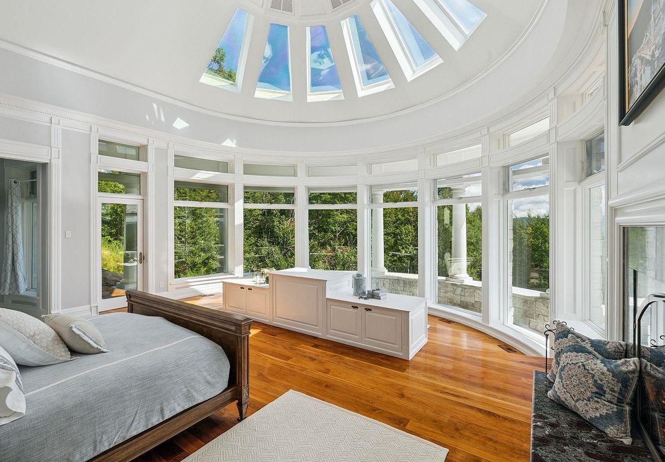 This exquisite sunroom features a stunning circular layout, allowing natural light to flood the space through floor-to-ceiling windows and a striking skylight. The elegant white trim adds sophistication, while rich hardwood floors provide warmth and contrast. A cozy bed invites relaxation, adorned with soft gray bedding and decorative pillows. A white cabinetry unit extends across the room, offering both style and functionality for storage. The serene color palette enhances the calm atmosphere, perfect for family gatherings or quiet contemplation. Framed by lush greenery outside, this sunroom seamlessly connects indoor comfort with the beauty of nature.