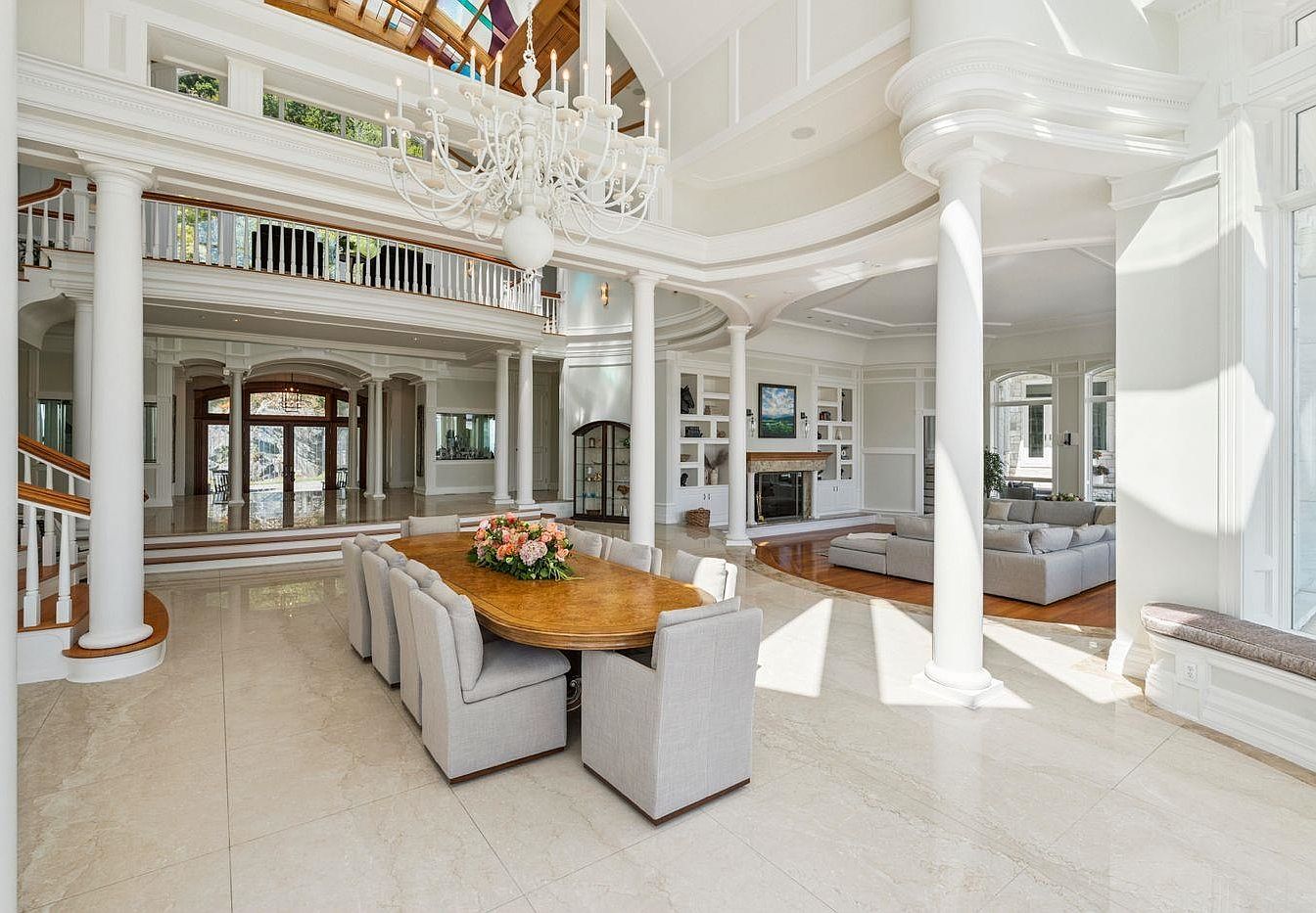 This spacious dining area exudes elegance and style, featuring a large, oval wooden table surrounded by plush, soft-gray upholstered chairs. The open layout flows seamlessly into an airy living space, where a cozy sectional invites relaxation. Towering ceilings adorned with stunning moldings enhance the grandeur, while floor-to-ceiling windows bathe the room in natural light. A tasteful chandelier hangs above, adding a touch of sophistication. The creamy, polished marble floor complements the light color scheme, creating a warm and welcoming atmosphere. Architectural details like the curved columns and custom built-ins reflect fine craftsmanship and family-oriented living.